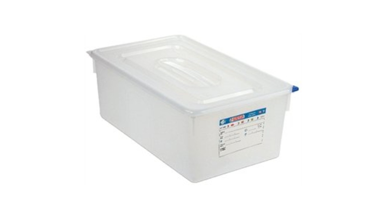 Colour coded airtight containers with lid.Sets of colour clips included (red, yellow, green & blue).Available in Gastronorm sizes.Temperature range -40°C to 95°C. Permanent wipe clean label fixed to each container, dishwasher proof