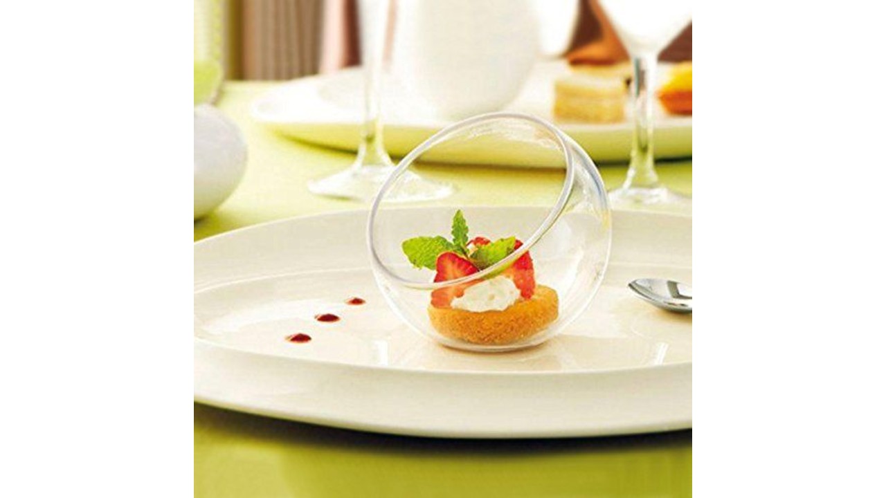 Mini half-bubble shaped dessert dish • Material: Annealed glass • Unique slanted design • Perfect for presenting tasters at dinner parties • Suitable for serving entrees, appetisers or desserts