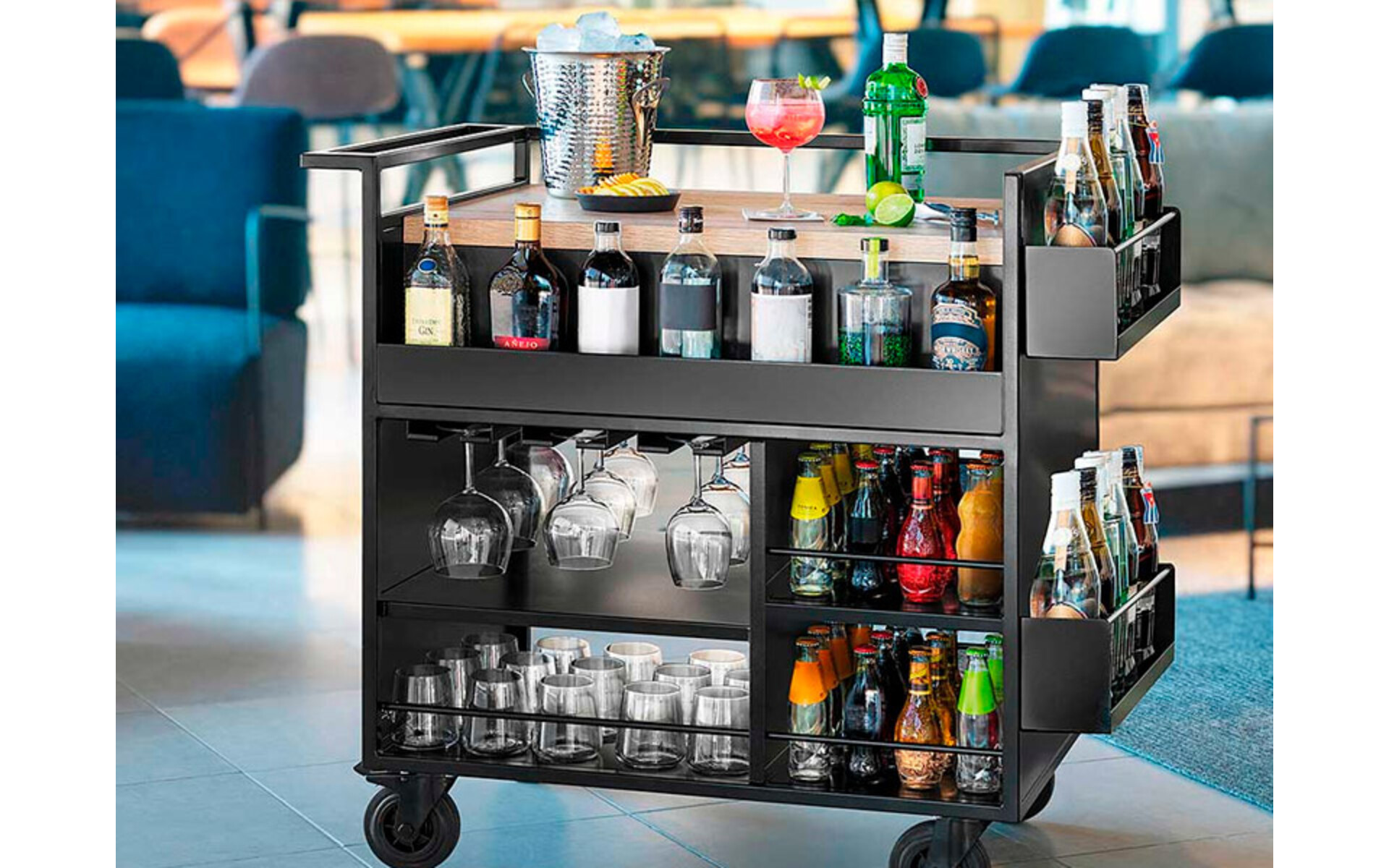 The design includes three rails for hanging glasses, specific shelves for mixers and a dedicated space for up to 20 drinks glasses. In addition, it has side shelves for storing bottles, all on a satin black paint structure that guarantees durability and a distinctive look.