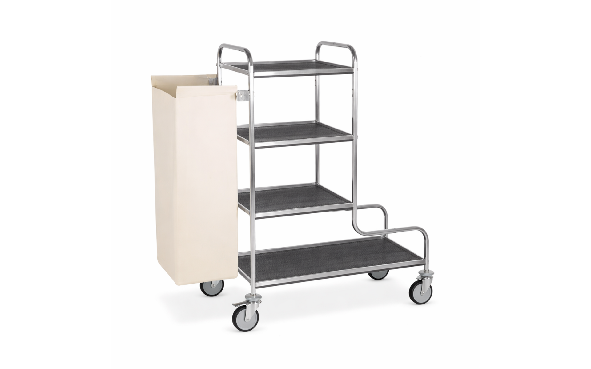 • Stainless steel 2x2 cm square tube frame • Melamine-faced shelves • Folding bag holder with canvas bag for dirty linen • Grey rubber bumpers • Swivel castors, ø 12.5 cm