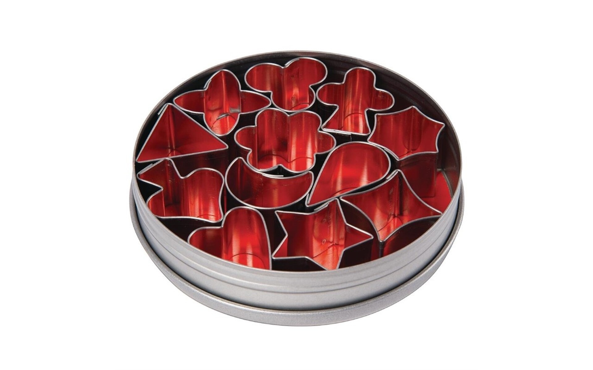 Aspic Pastry Cutter Set box with 12 assorted pieces. Weight 120 g. Made of tinned steel. This set of 12 mini cutters is perfect for creating decorations to top anything from cakes and biscuits, to pies and tarts.