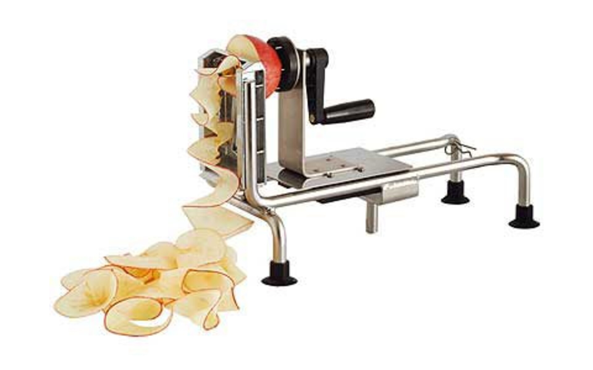 Stainless Steel Spiral Vegetable Slicer Le Rouet. Reduce food preparation time with this Fruit and Vegetable Turning Slicer. This spiral slicer is a great option when looking to slice ingredients quickly and consistently. With this kitchen tool you can get your ingredients sliced within seconds. Housing and pusher made of stainless steel. Knife holder made of cast aluminum, tempered stainless steel blades. Enables cutting strings of vegetables, to weave decorative mats, make coleslaw or other vegetable salads. Comes with 3 spiral blades, 5/64", 1/8" and 1/4" and a straight and fluted blade. Includes Clamp axle. Weight: 9 lbs. 2 oz.