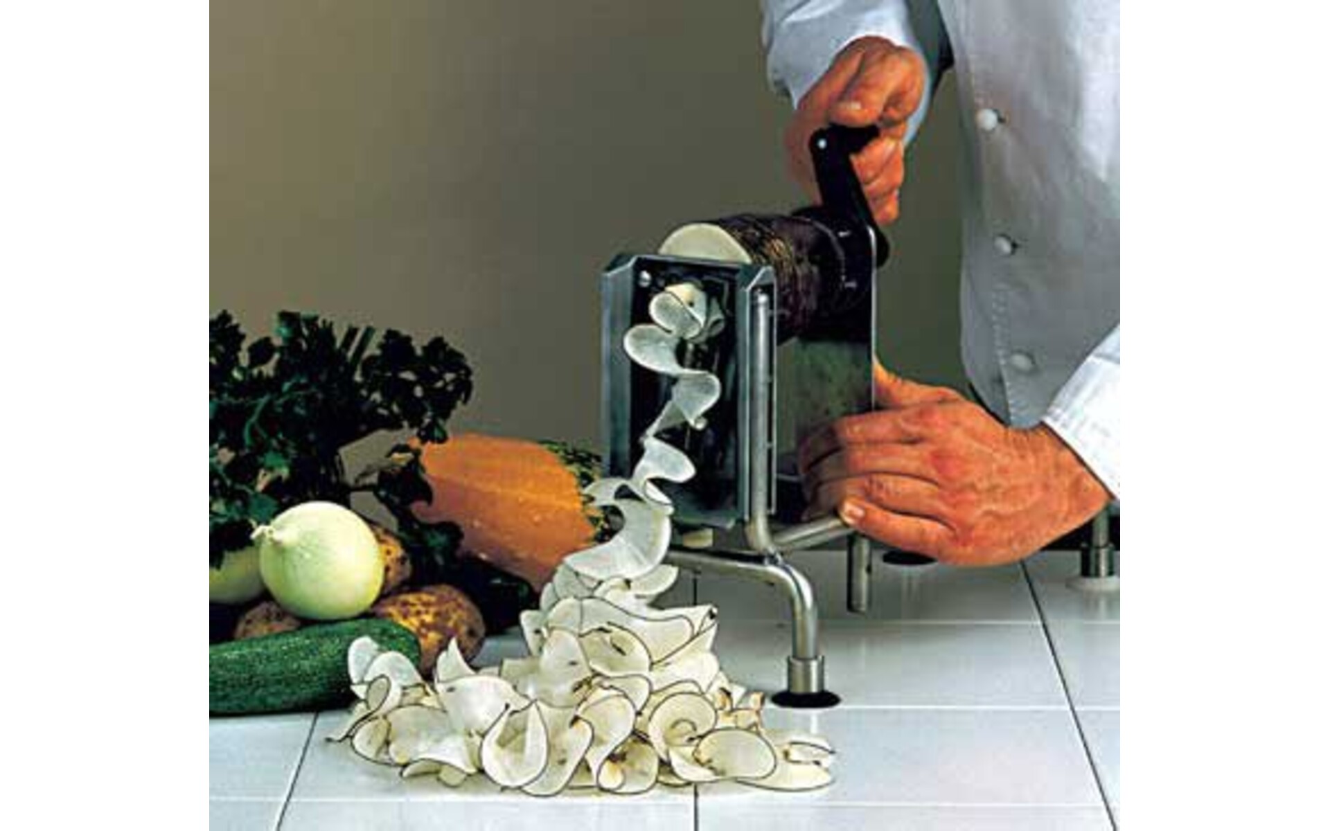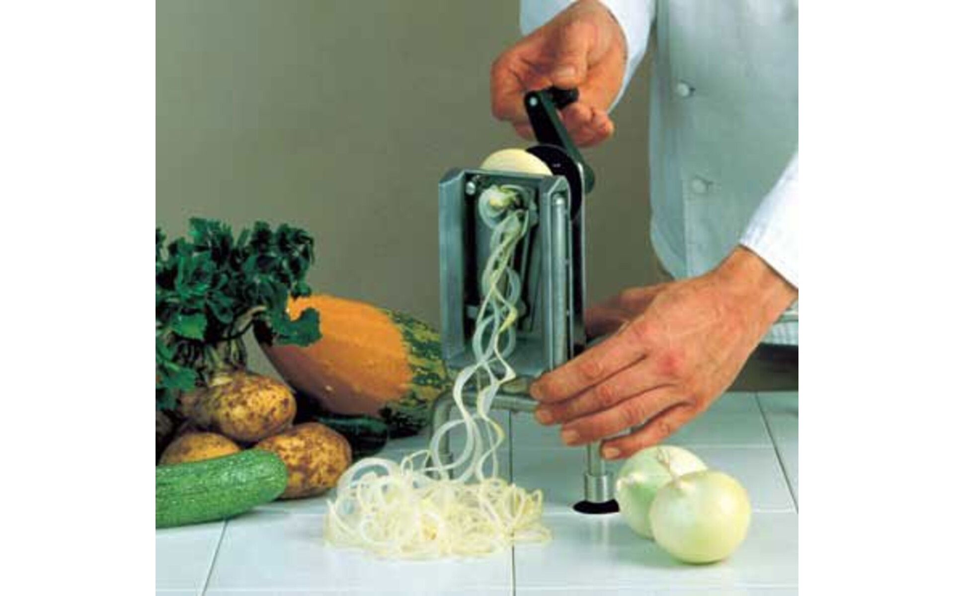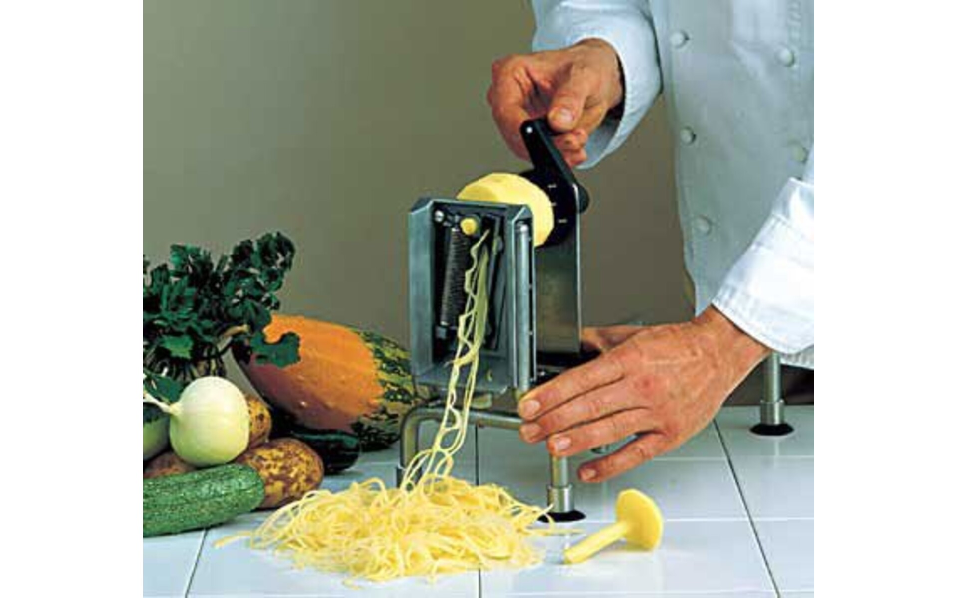 For making strings of, for example, carrots, potatoes, onions, cucumbers, etc. for salads and decoration. Lockable by means of suction feet Comes with 3 stainless steel blade combs