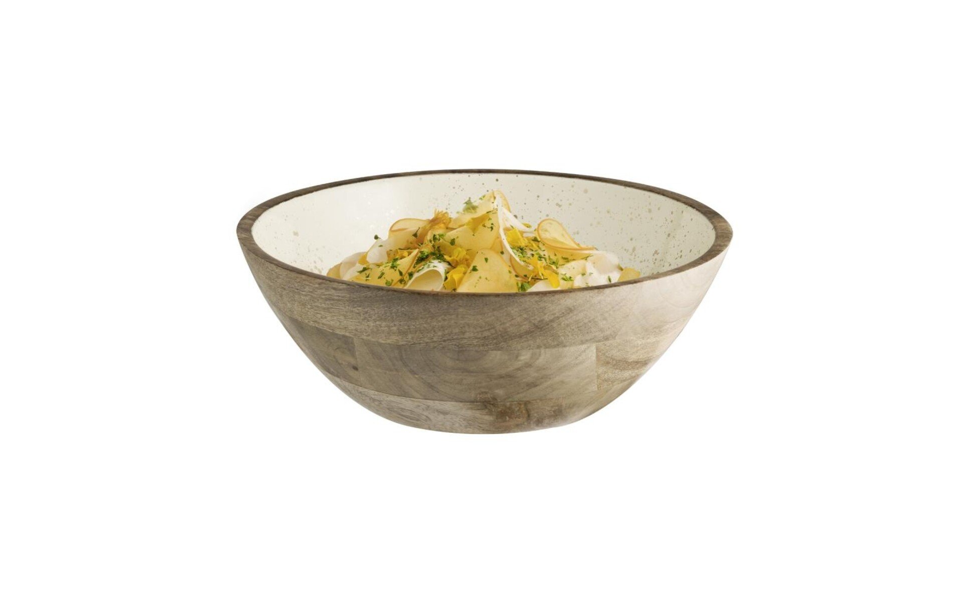 Dimensions : Ø 30 cm. Content 3,0 liter. Height 10,5 cm. Handmade mango wood stackabale bowl with a refined inner epoxy resin coating. Not dishwasher safe. Ideal as a poké bowl !