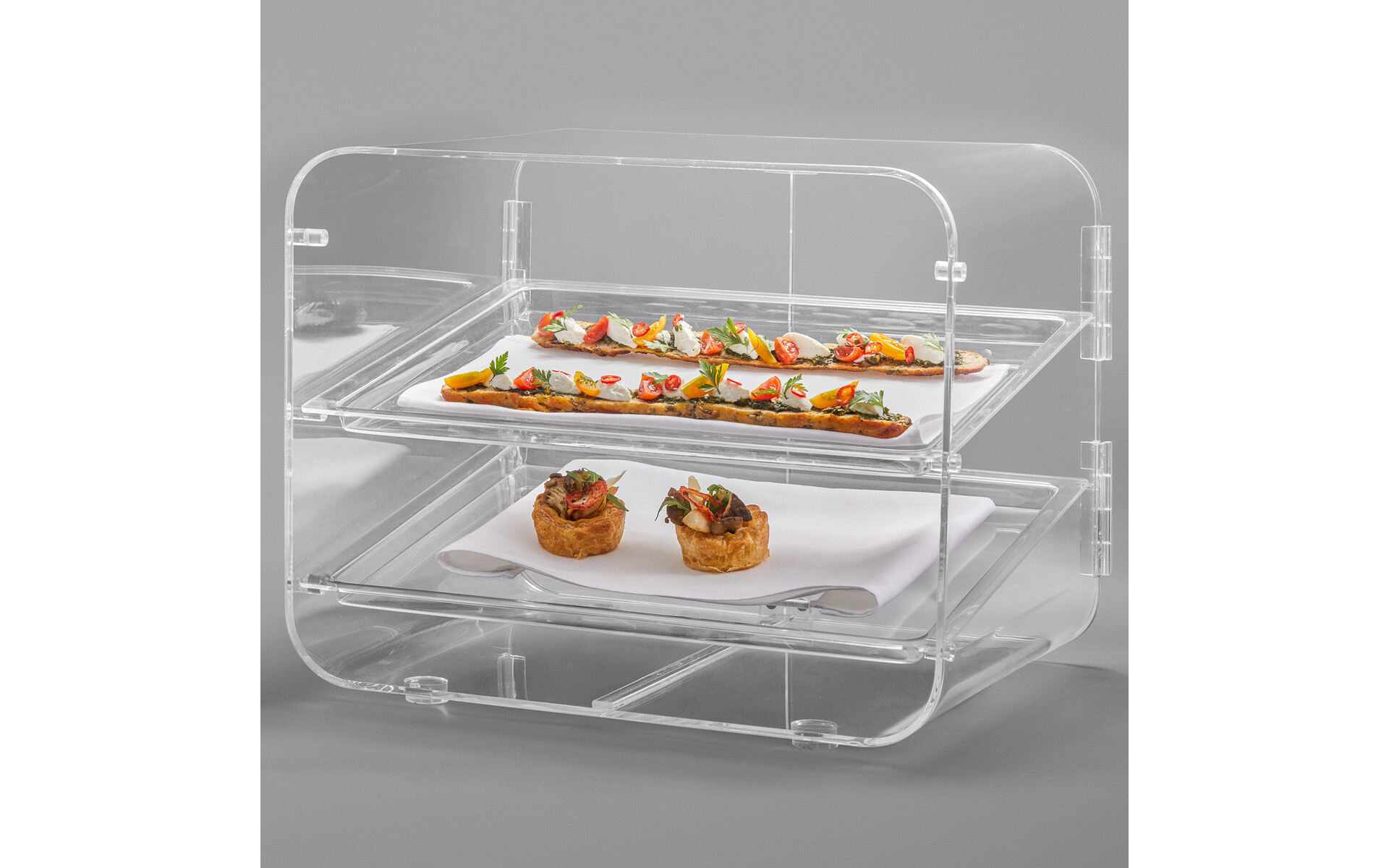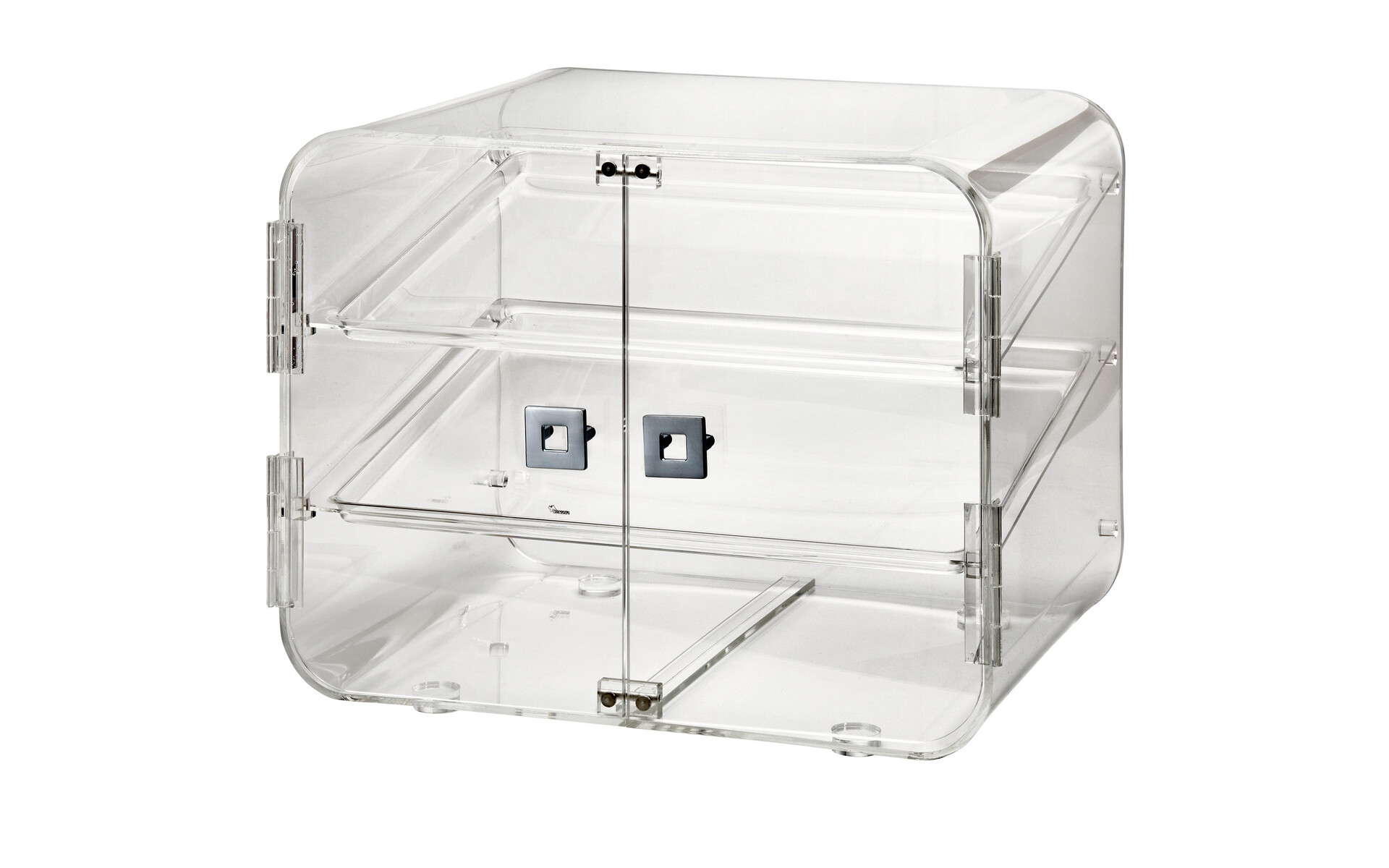 1 acrylic display with two levels and two doors dim. 47 x 37.6 x 37.6 cm