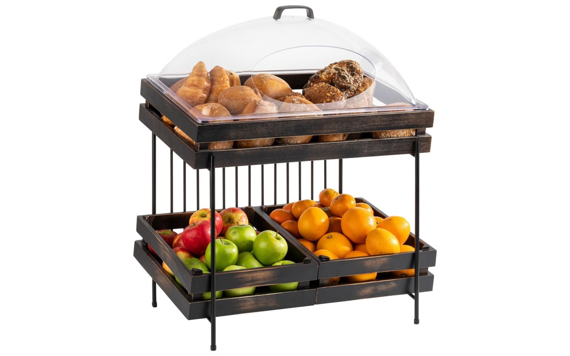This buffet display consists in one black metal stand, with one black wooden GN 1/1 tray height 10,5 cm forseen with a cloche made of SAN plastic and two black wooden trays GN 1/2 height 10,5 cm.