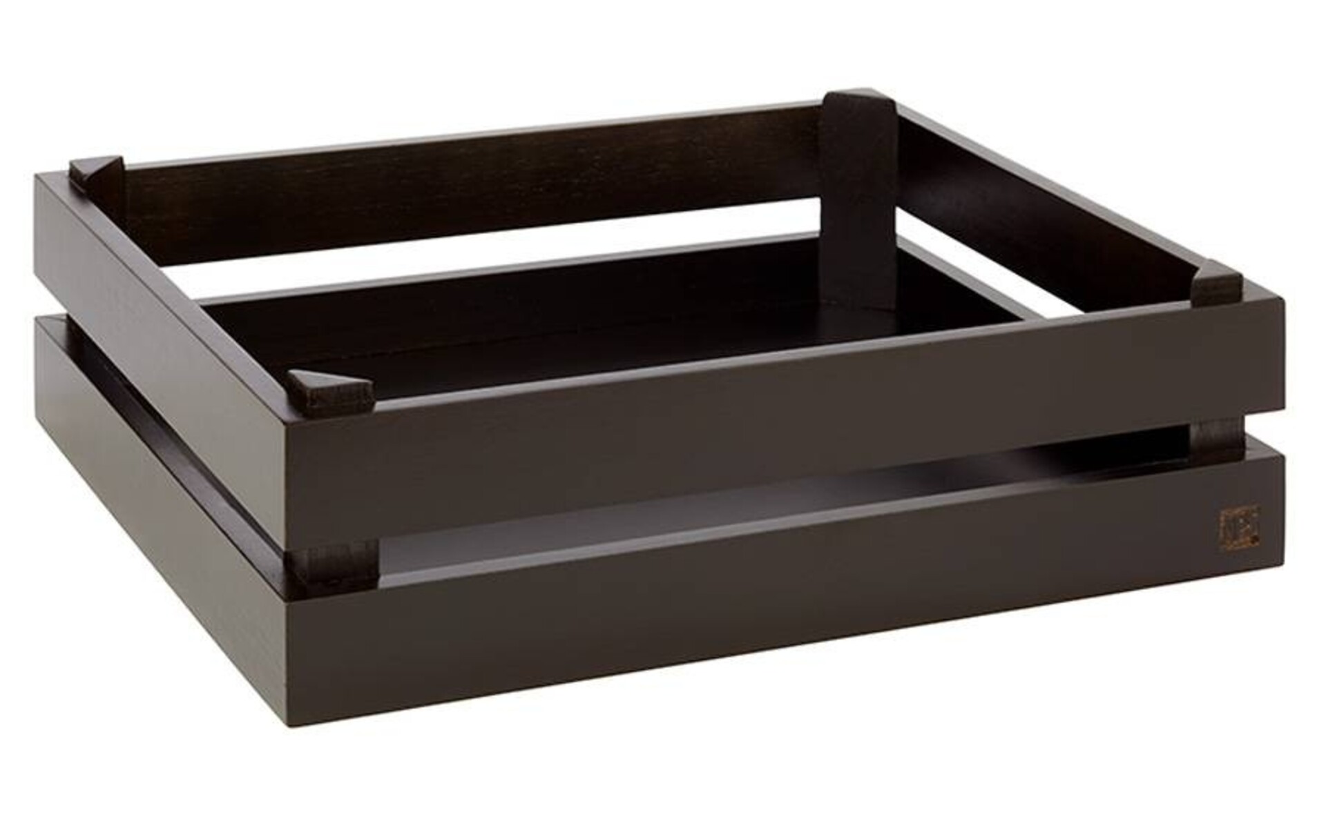 This set includes one black metal stand, with one black wooden crate GN 1/1 height 10.5 cm forseen with a SAN plastic cloche with frontal opening and two black wooden crates GN 1/2 height 10,5 cm, made of black braided polypropylene PP wire.
