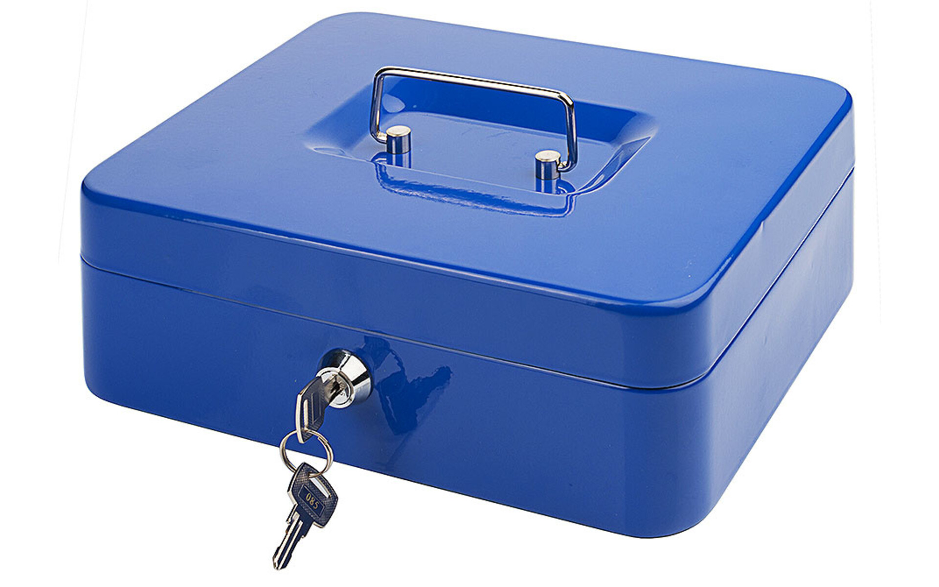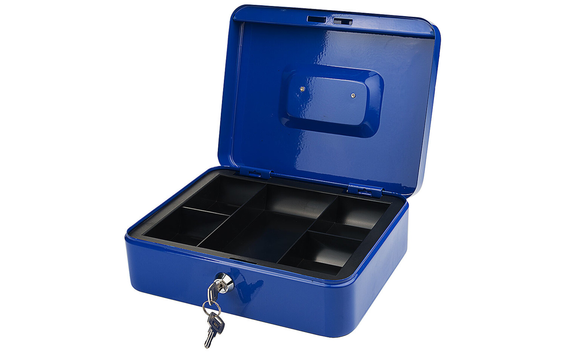 Dim. 25 x 18 x h 9 cm. Lacquered steel, with cylinder lock, equipped with 2 keys, with polystyrene coin insert with 5 compartments, lid with movable handle