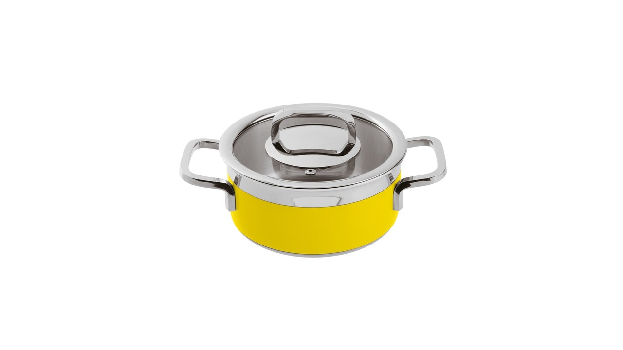 Paderno serie 2300 3-ply has a super heat-conductive multi-layer construction that distributes heat from bottom to rim quickly and evenly. An attractive, multifunctional and colored line available in yellow, green, blue and orange. External finish with special heat-resistant paint. Ideal for all types of cooking including induction. The lid equipped with a steam release device can be hooked to the side of the pan.