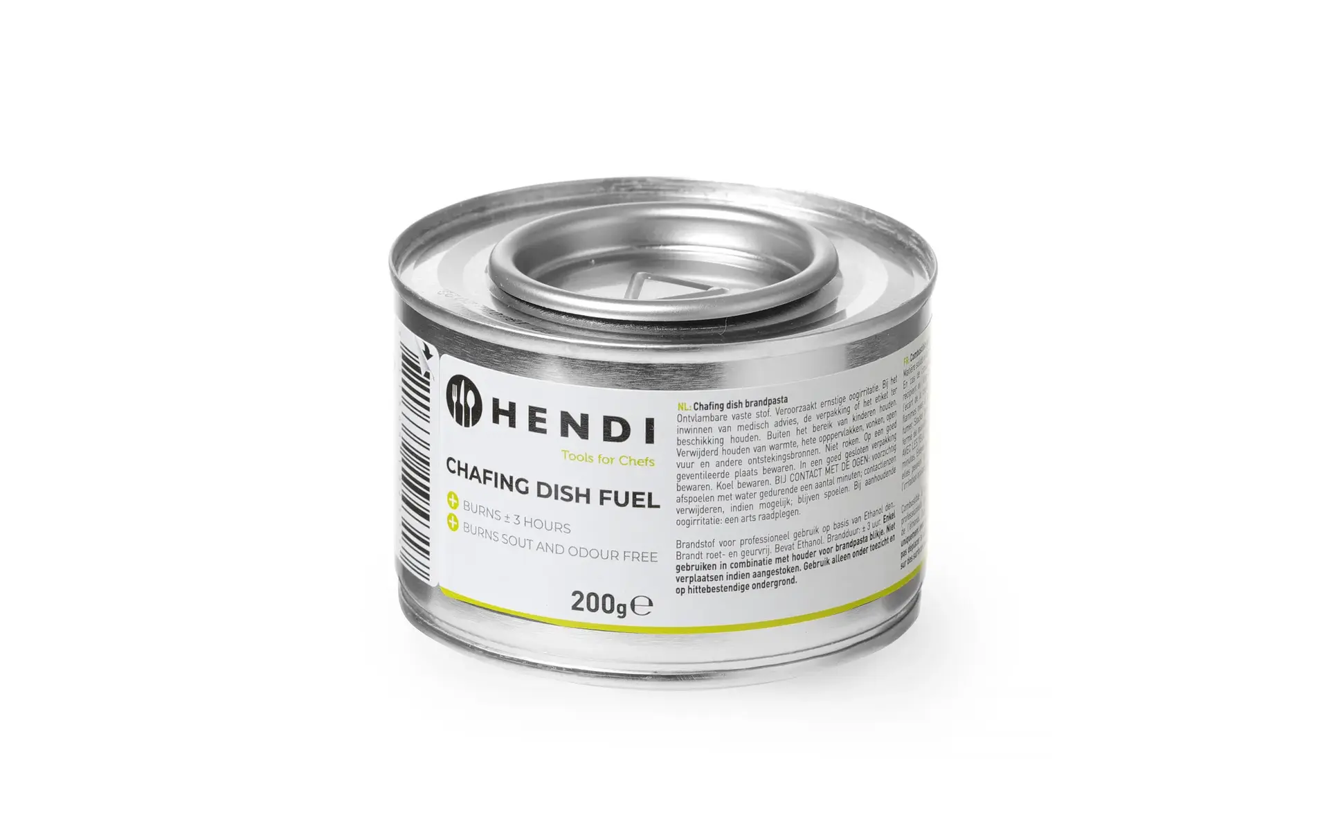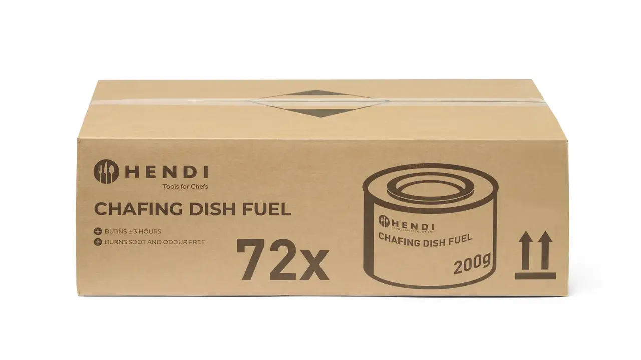 200 g chafing dish fuel paste, burning time ±3 hours. Made from ethanol, soot- and odor-free, artificially bitter. Always use a fuel paste holder. Flame is almost invisible. Extinguish by closing the lid. Refill only after cooling.
