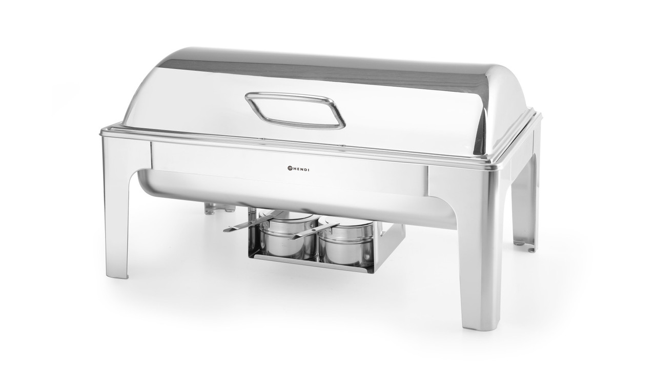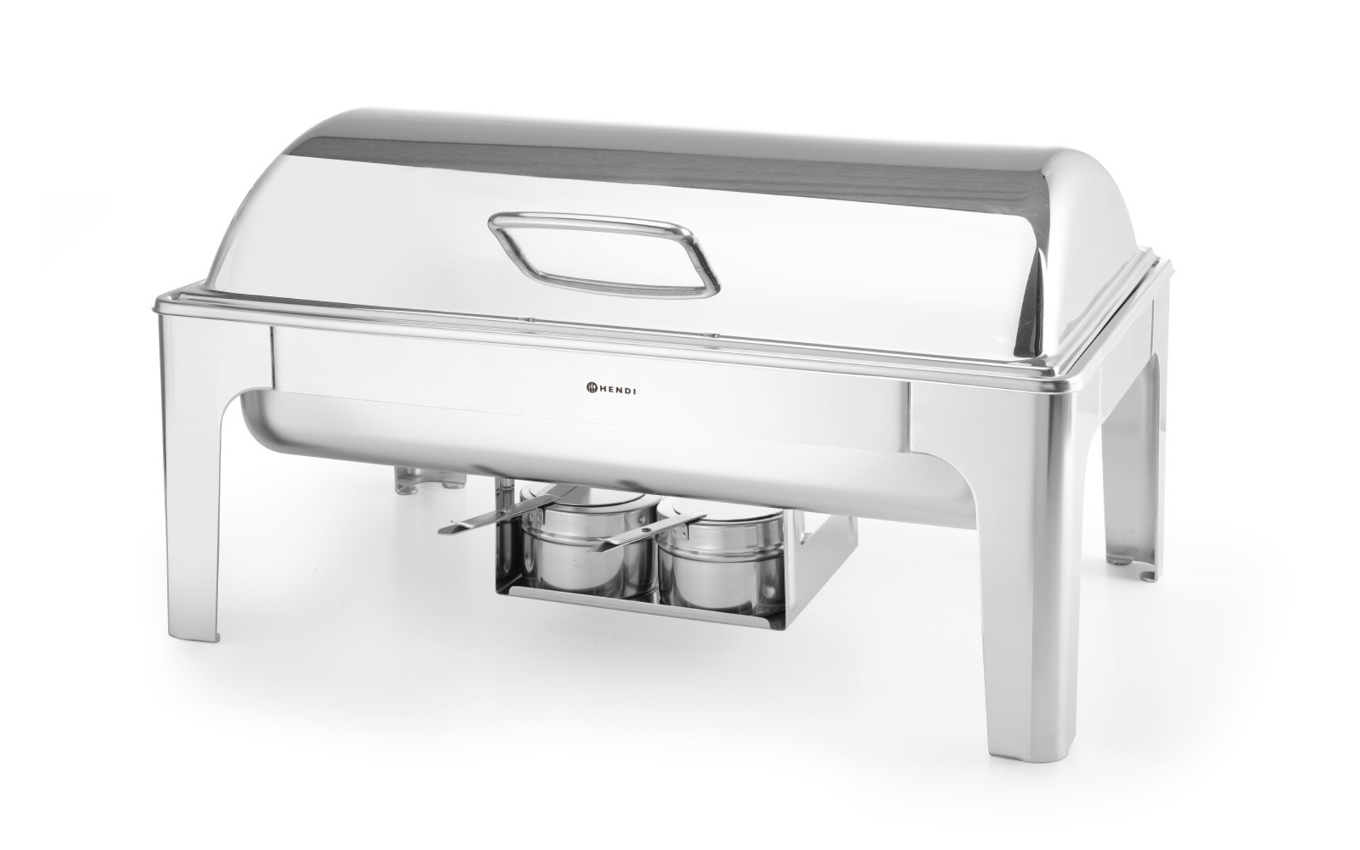 Ideal for buffets and catering. By using high-quality material and a beautiful finish, these chafing dishes give every presented dish a certain allure. The chafing dishes and accessories are entirely made from durable stainless steel. The lid is fitted with a friction brake, it stays in the position in which it is left. The lid can be removed to ease cleaning. Supplied with removable water pan, GN 1/1 65mm deep food pan and 2 chafing dish fuel can holders.