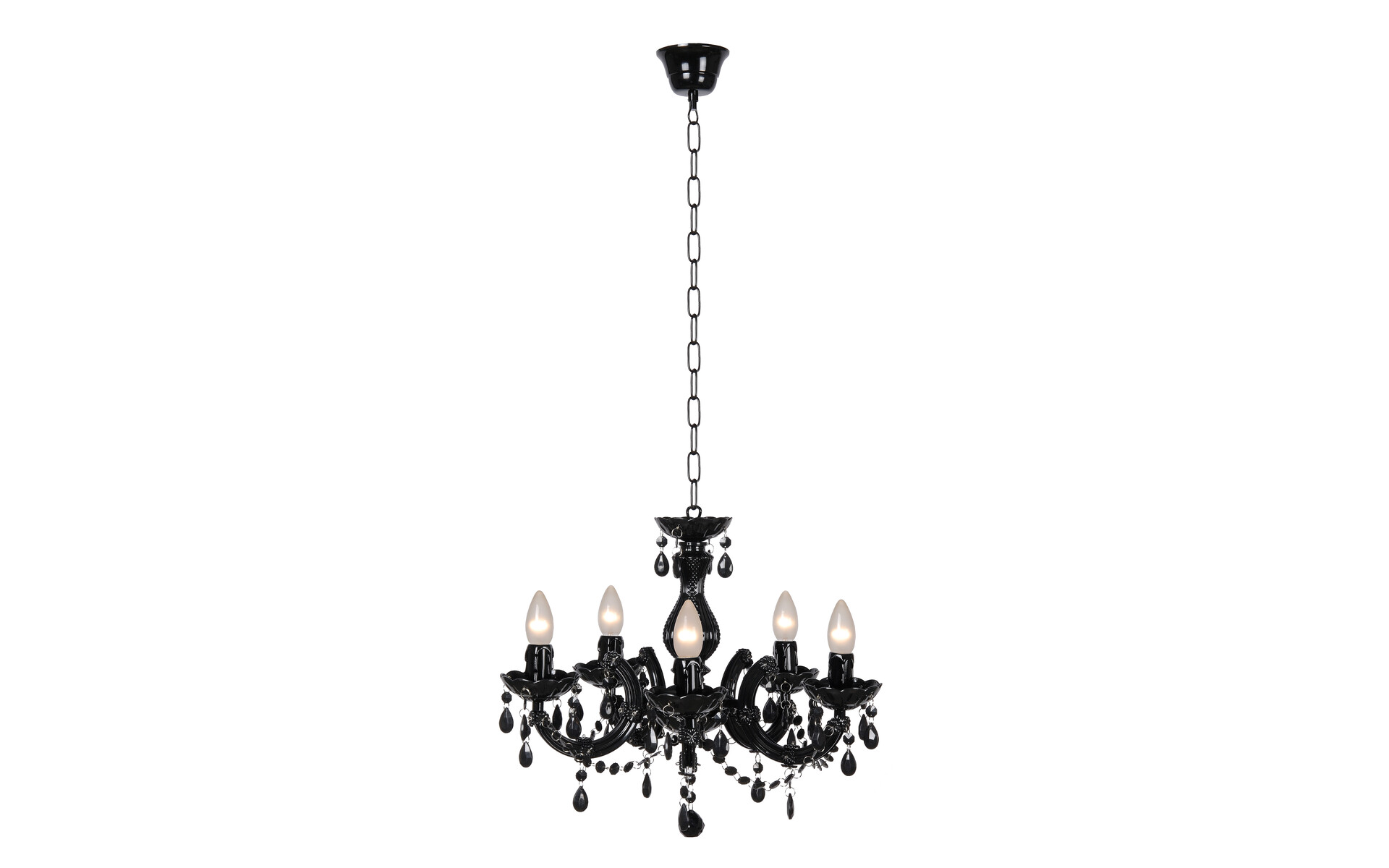 This Arabesque chandelier is a chic and beautiful. Suitable for every space and available in a choice of stylish colours, black or transparent. This Arabesque chandelier has a maximum height of 100 cm and a diameter of 48 cm and has five E14 fittings bulbs are NOT included.
