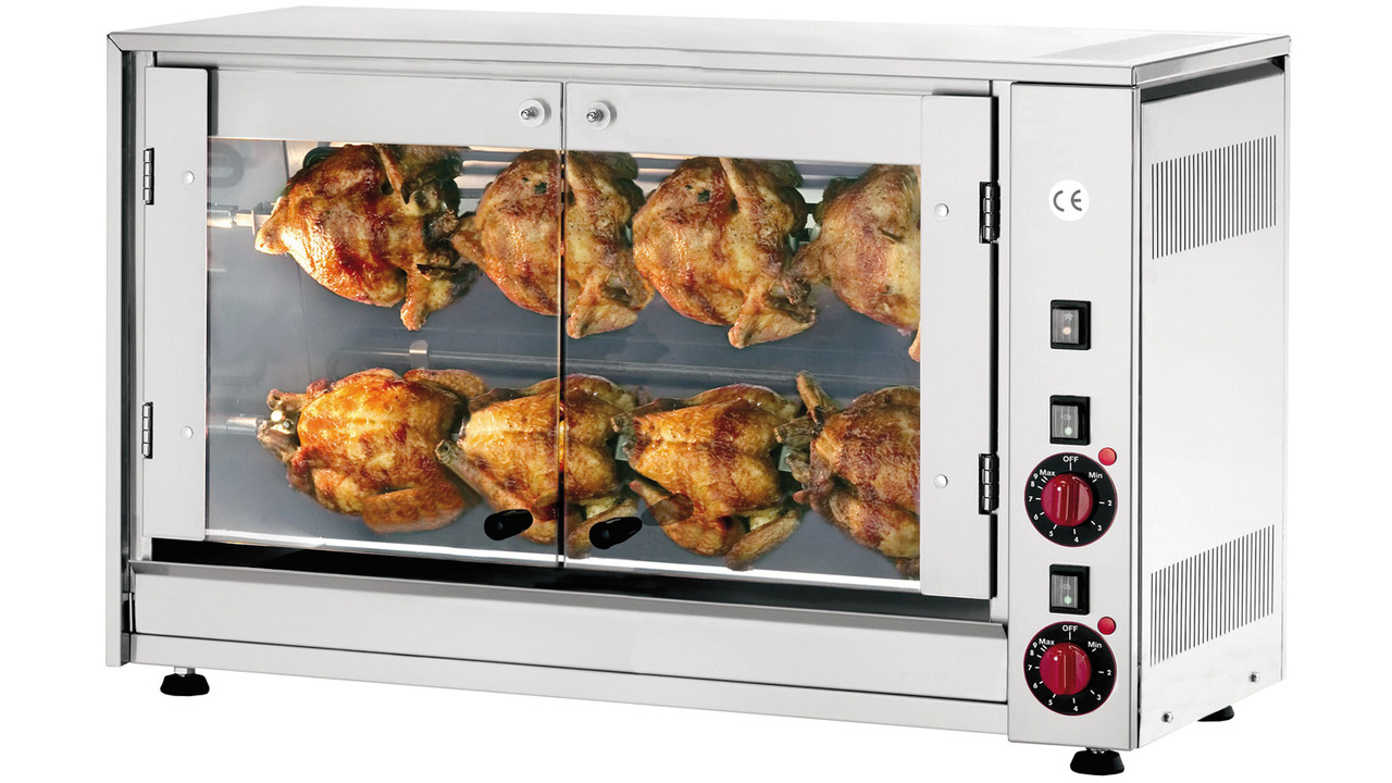 Stainless steel casing • interior lighting • spits separately adjustable • fat drawer • 2 spits à 4 pcs = 8 chickens