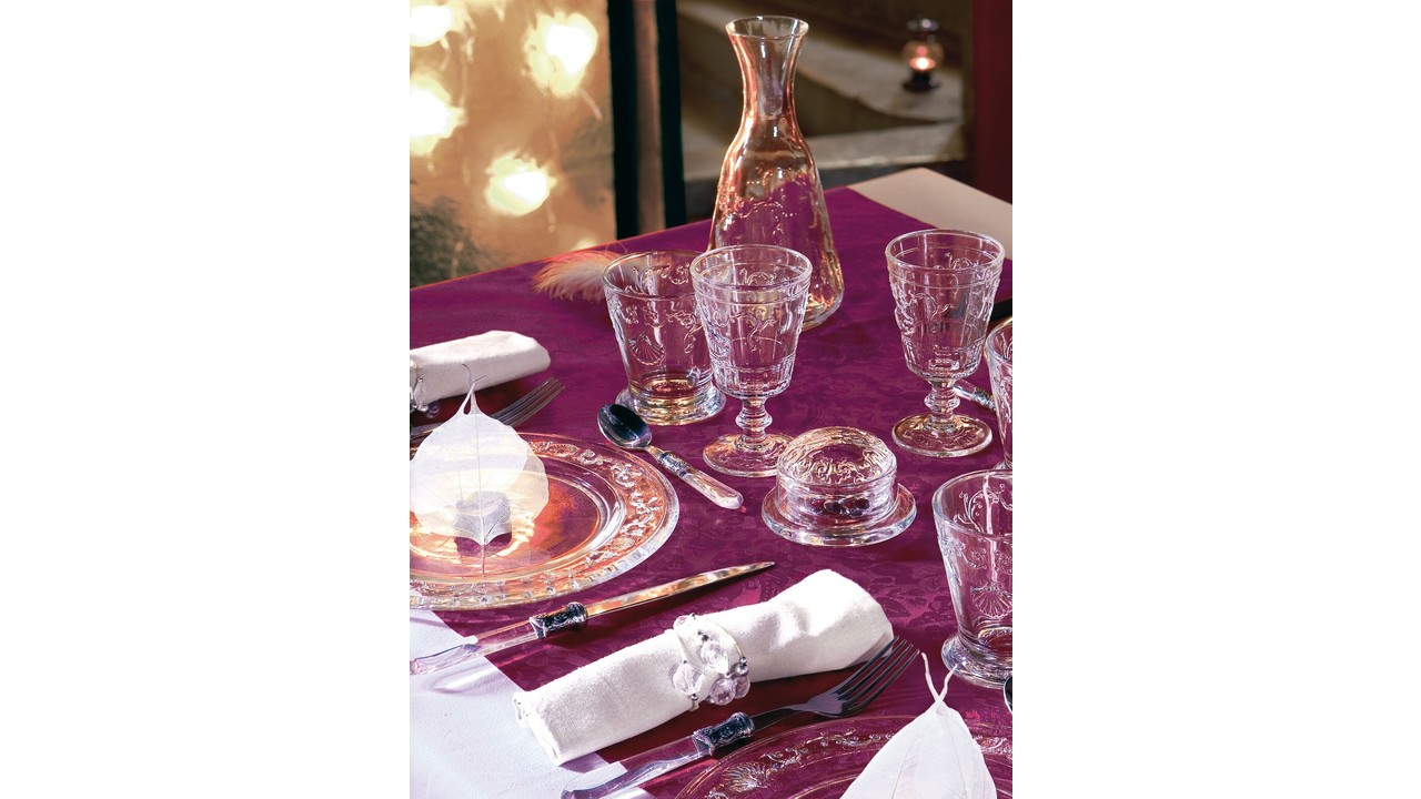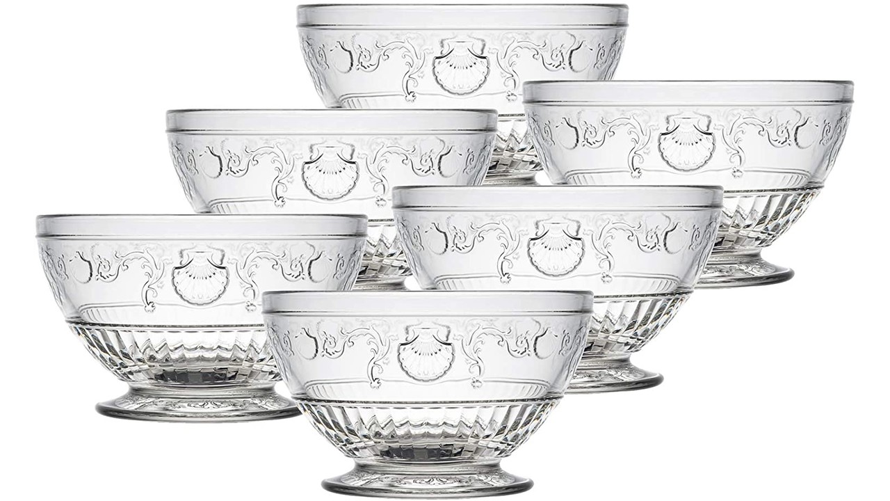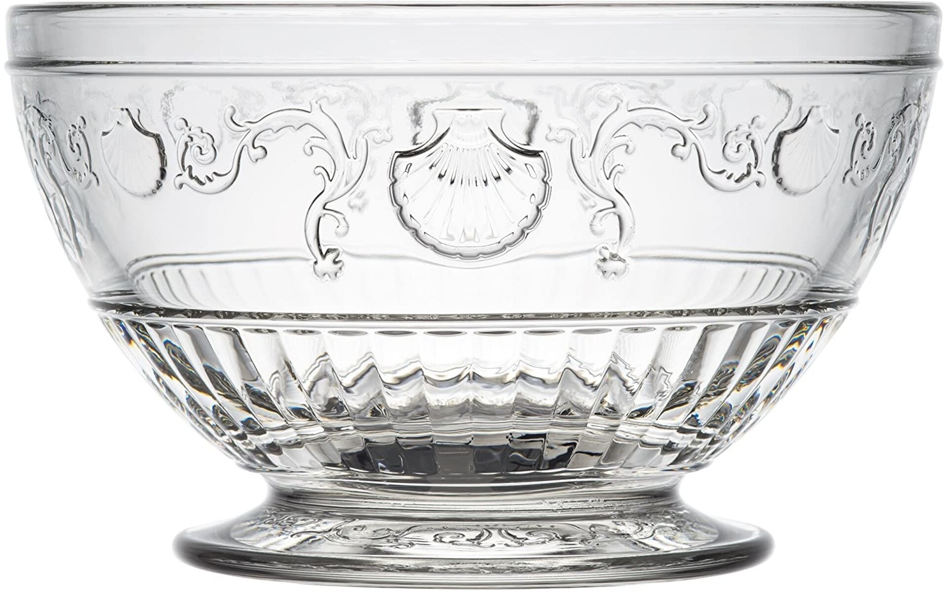 Made from pressed glass, this large capacity goblet . Features baroque embossed patterns, volutes, flowers and scallops. Elevate your tabletop style with these decorated bowls. Each glass is adorned with a shell and flower motif accompanied by an elegant faceted skirt base that radiates iconic French style.