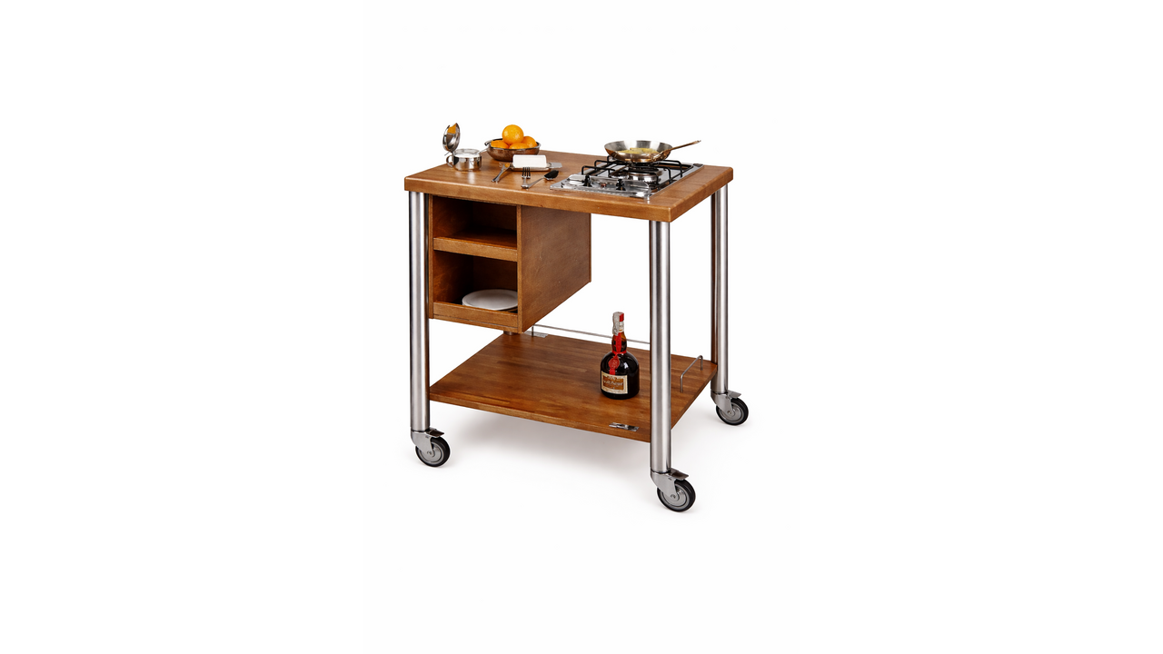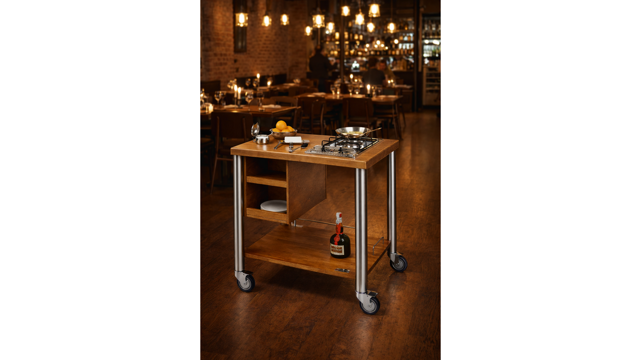 Professional cooking trolley designed for live food preparation and service directly at the table or in guest areas.