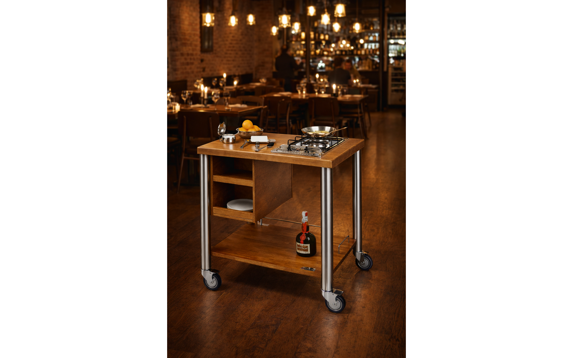 The trolley is equipped to allow on-board cooking, making it ideal for hotels, restaurants, catering, and buffet service. Its sturdy construction, generous work surface, and integrated storage ensure safe, practical, and efficient operation.