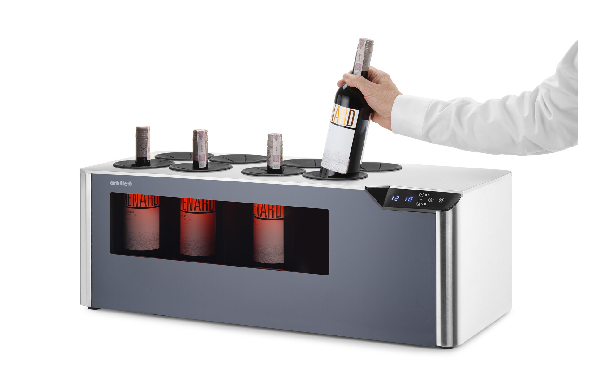 The Arktic Countertop wine cooler, 2-zone Cellar offers a seamless blend of style and function for bars, boutique hotels, tasting rooms, and fine dining establishments. Its compressor technology not only cools but also adjusts the temperature if the wine needs warming, maintaining the ideal conditions throughout the year. Its compact design holds 8 bottles, and the sleek touch screen with customisable LED lighting (white, amber, or cold blue) elevates the aesthetic, turning the wine display into part of the guest experience.