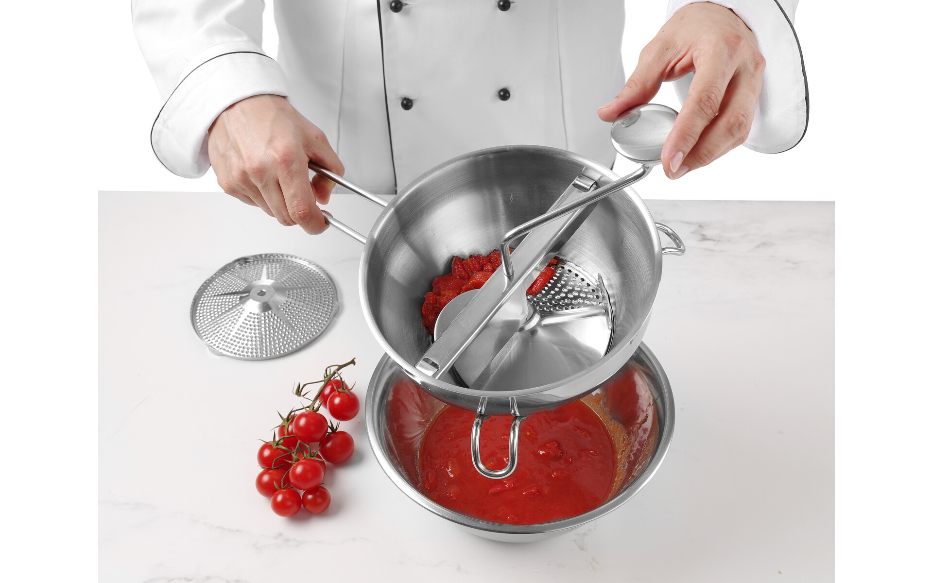 Perfect for preparation of cream soups and tomato sauces. Including 2 straining discs (Ø 140 mm), coarse and fine.