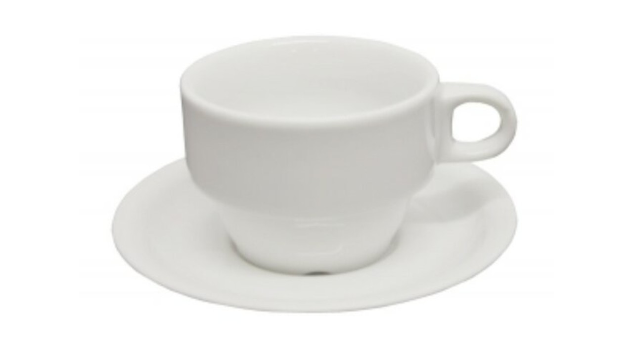 Stackable cup supplied with saucer. Reinforced hotel porcelain. White color.