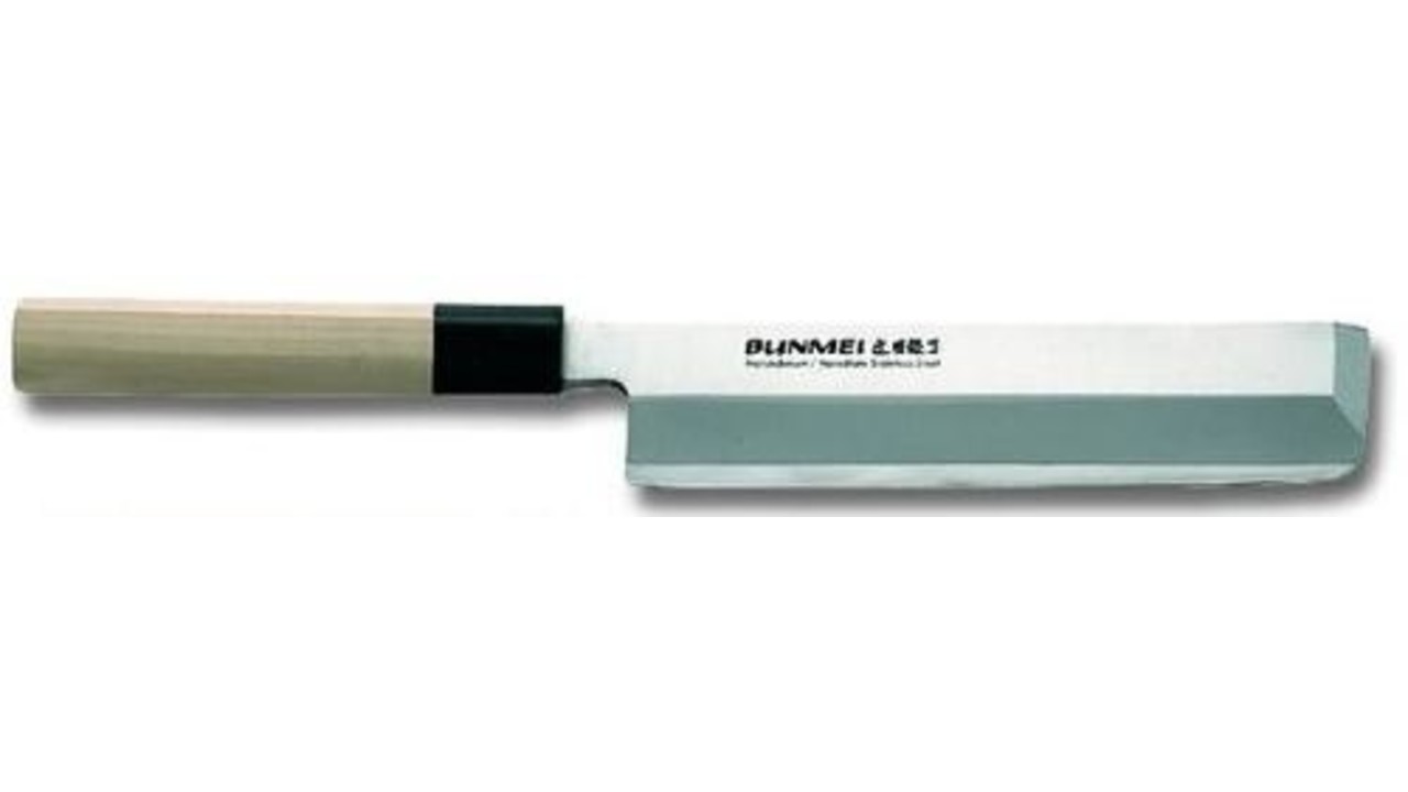 Resistant and wide asymmetric blade made of molybdenum/vanadium stainless steel. Wooden handle with black bolster. Traditional Japanese knife, ideal for cutting and chopping vegetables. Very sharp. Not dishwasher safe.