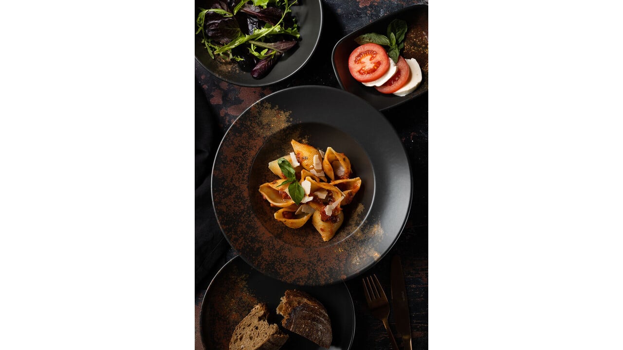 Oxy is a broad collection with oriental overtones. Based upon a dark satin glaze each piece is enhanced with hand decorated fiery tones adding drama to the serve. Dishwasher safe, for professional use. Hand finished making each piece unique.