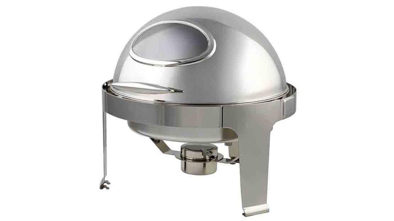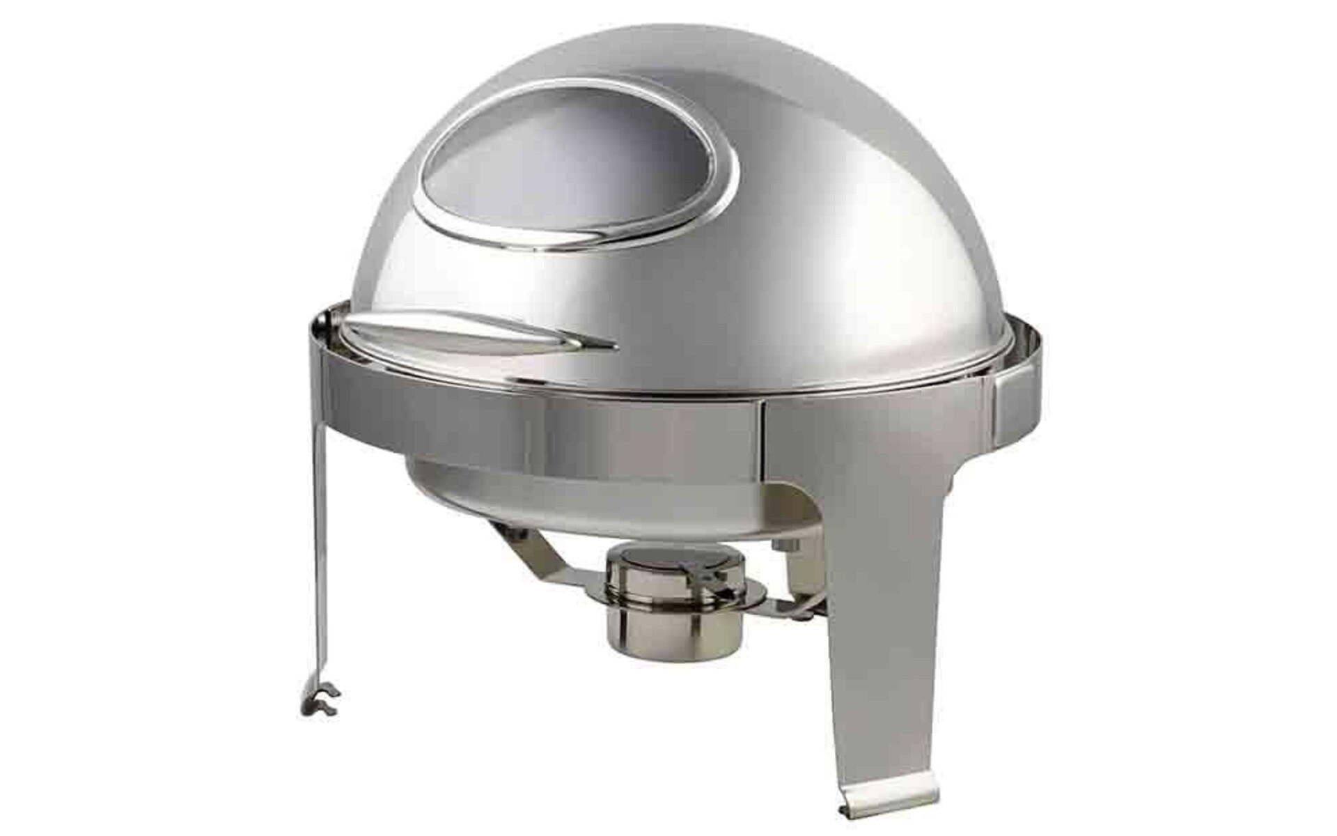 Polished, rolltop cover with window adjustable at 9° and 18°, foodpan 65 mm deep + waterpan + 2 burner holders, change of the container without removing the lid (condensed water can not be led back into the waterpan)