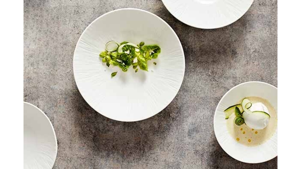 The Pure White tableware perfectly balances modern design with classic elegance. Crafted from high-quality porcelain, this tableware exudes tranquility and refinement. The matte and subtly grooved exterior combines captivatingly with the elegant glazed plate mirror. This combination creates a captivating contrast that stands out in any restaurant or bar. The sleek, bright white design provides a stylish backdrop that beautifully showcases culinary creations.