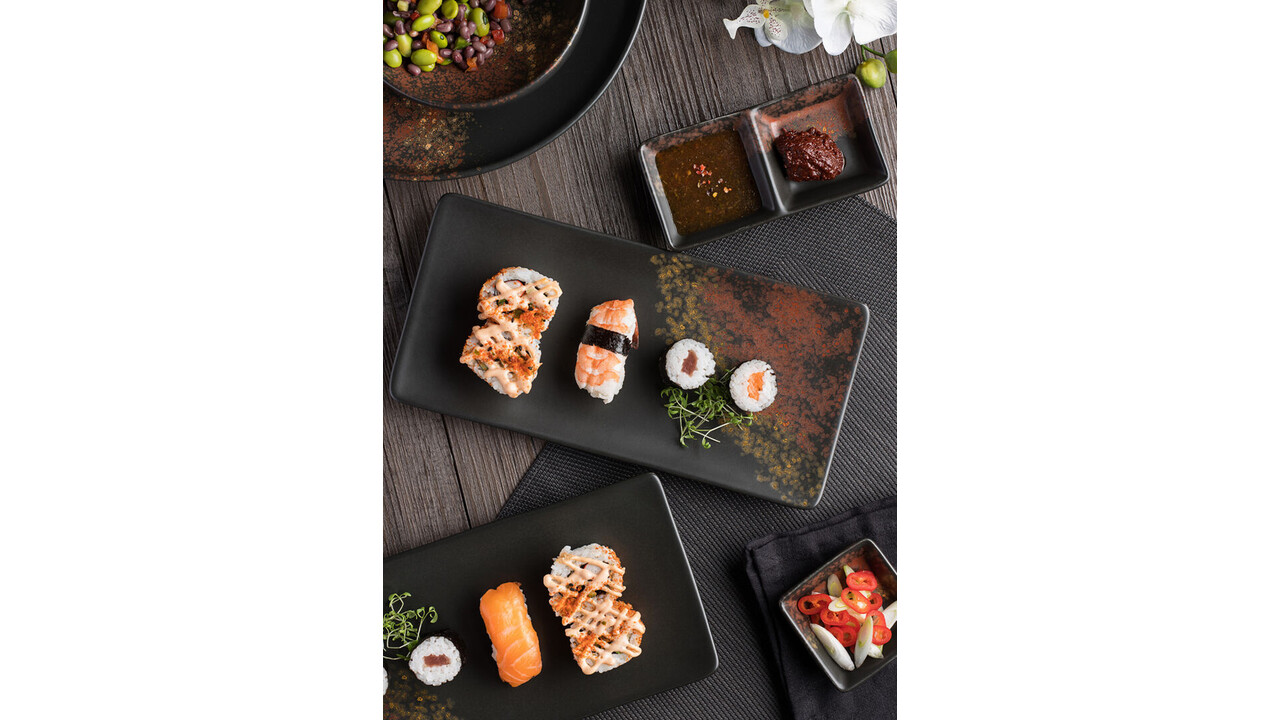 Oxy is a broad collection with oriental overtones. Based upon a dark satin glaze each piece is enhanced with hand decorated fiery tones adding drama to the serve. Dishwasher safe, for professional use. Hand finished making each piece unique.