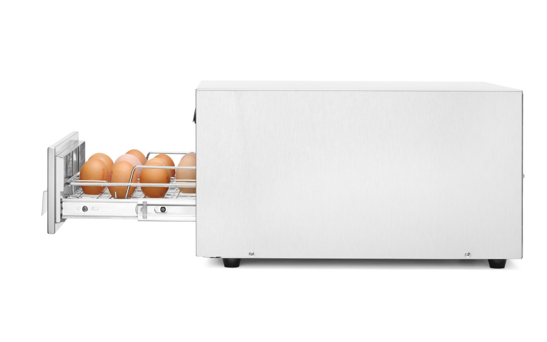 Indispensable for each kitchen in school, hotel, restaurant, canteen or pastry shop. Disinfects 30 eggs at a time. UV resistant grid fixed in bearing drawer. Eggs get sterilized in a process of irradiation with waves of 253,7 nm length. Irradiation (sterilization) takes around 2,30 minutes. Eggs can be used right after the disinfection process. Lamps are turned off automatically when opening the drawer. Stainless steel casing. Bearing-mounted egg rack made of stainless steel. UV radiator life: 7500 h. Can also be used for kitchen knife.