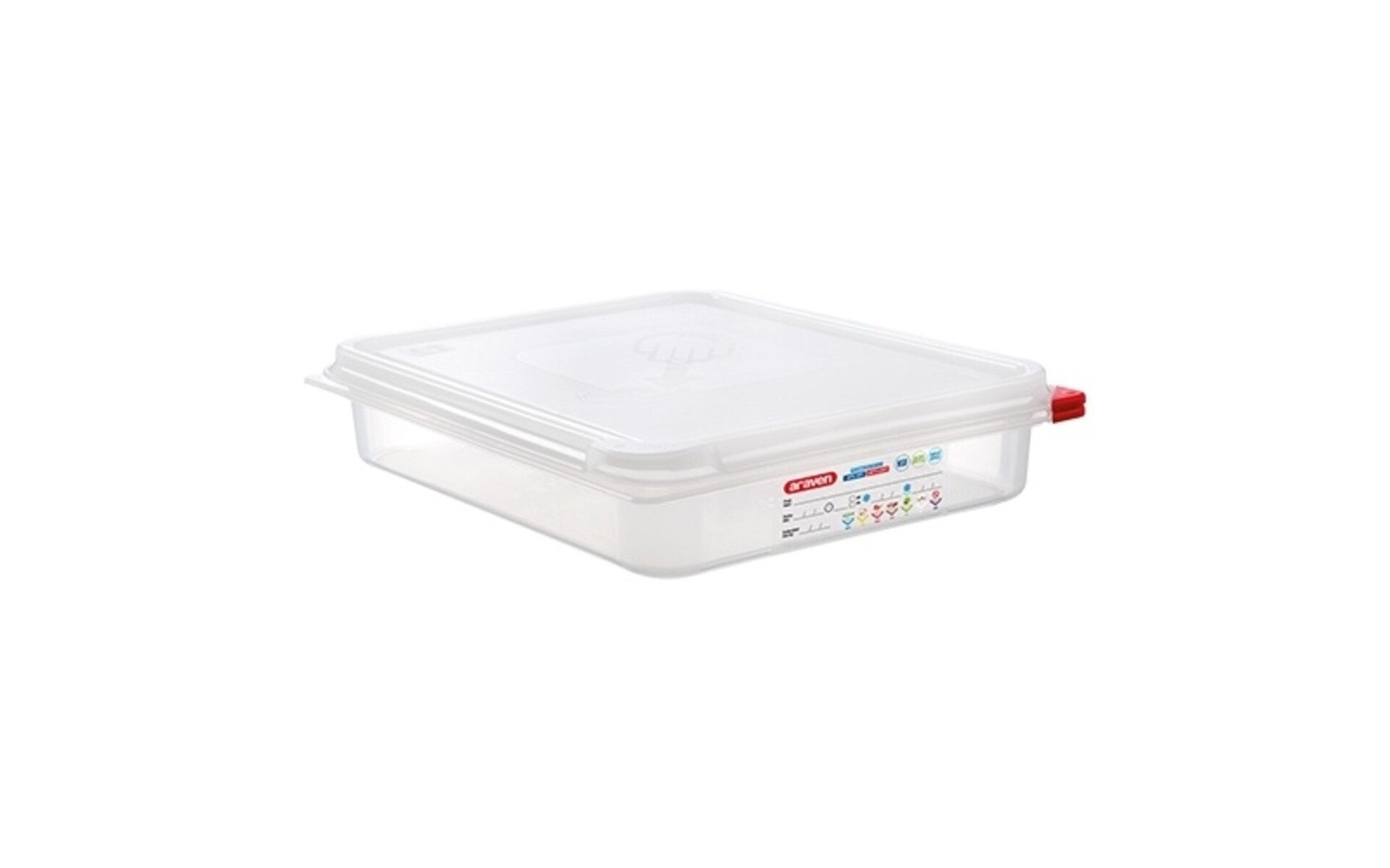 Airtight gastronorm sized container with lid. Each container is supplied with a set of colour coding clips (red, yellow, green and blue) and permanent wipe clean label for easy identification of contents and simplified food rotation