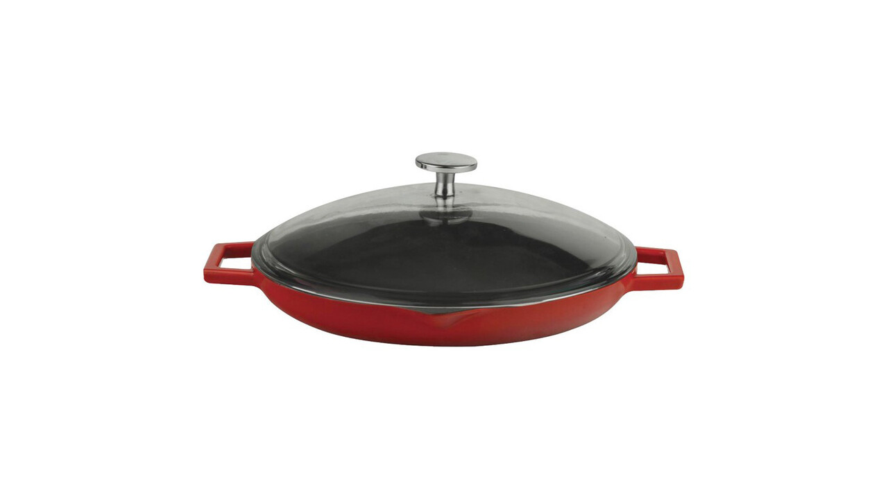 Red enamelled coated cast iron, with spouts. Thickness bottom : 5 mm. Thickness edge : 4 mm. Height 12,8 cm lid included. Content : 2 liter. Suitable for all heating ranges induction included.