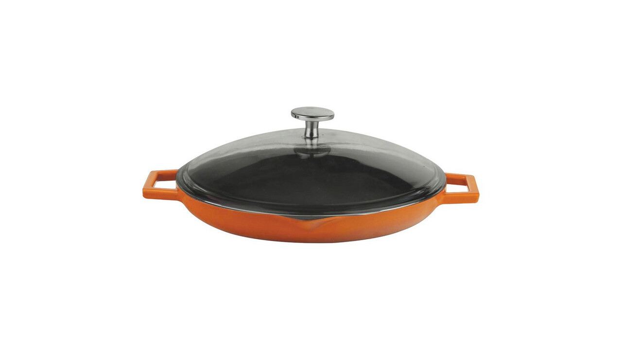 Orange enamelled coated cast iron, with spouts. Thickness bottom : 5 mm. Thickness edge : 4 mm. Height 12,8 cm lid included. Content : 2 liter. Suitable for all heating ranges induction included.