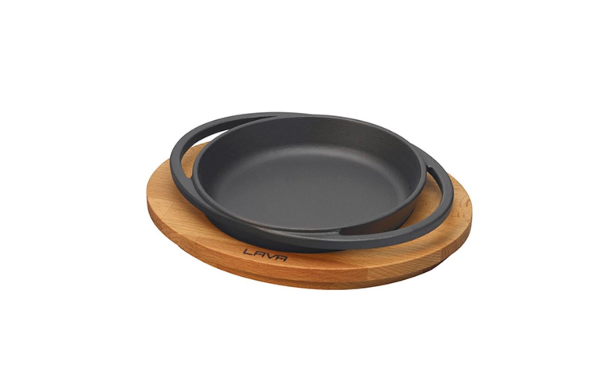 • The cast iron plate sits on a wooden base for easy transferring and carrying