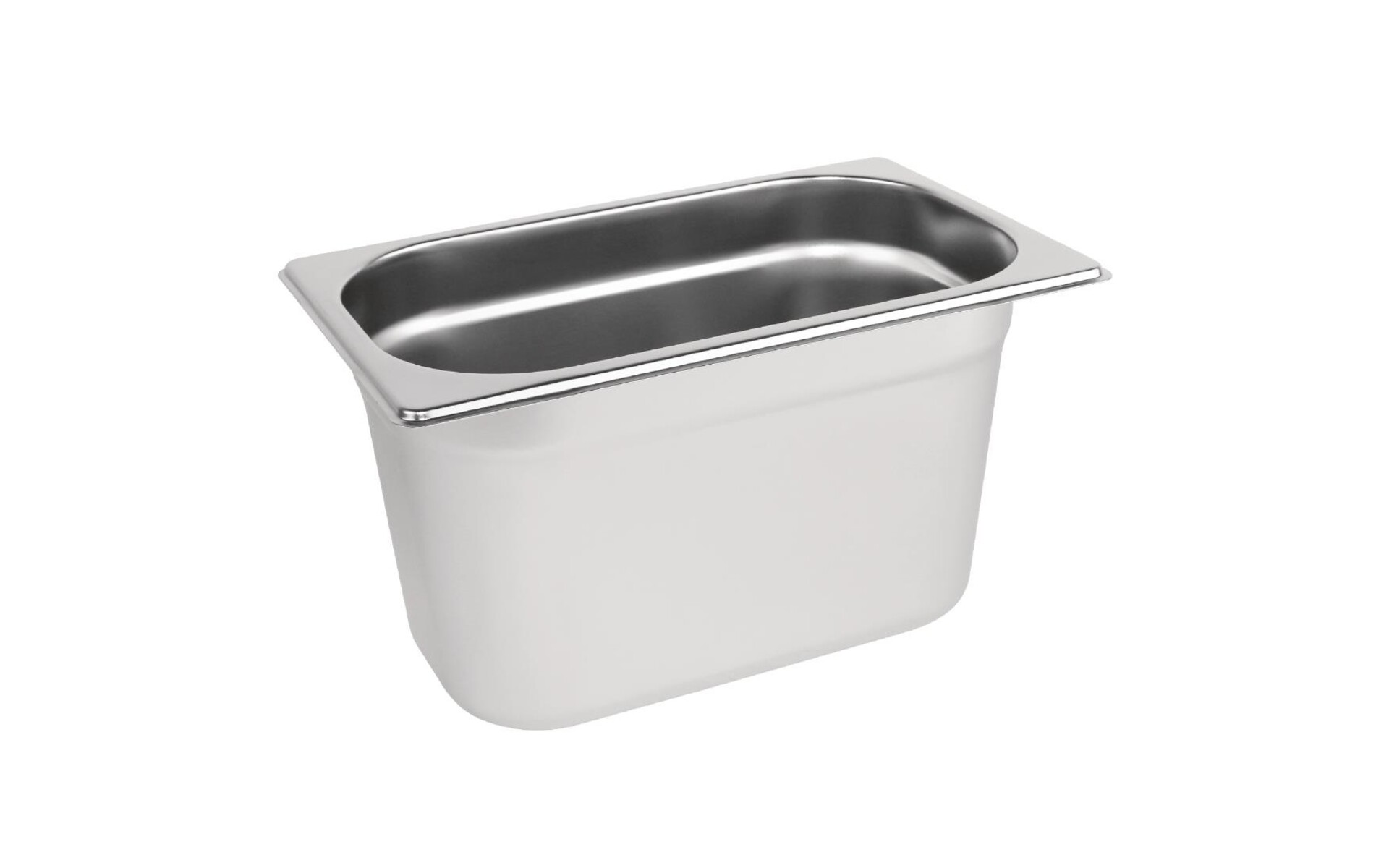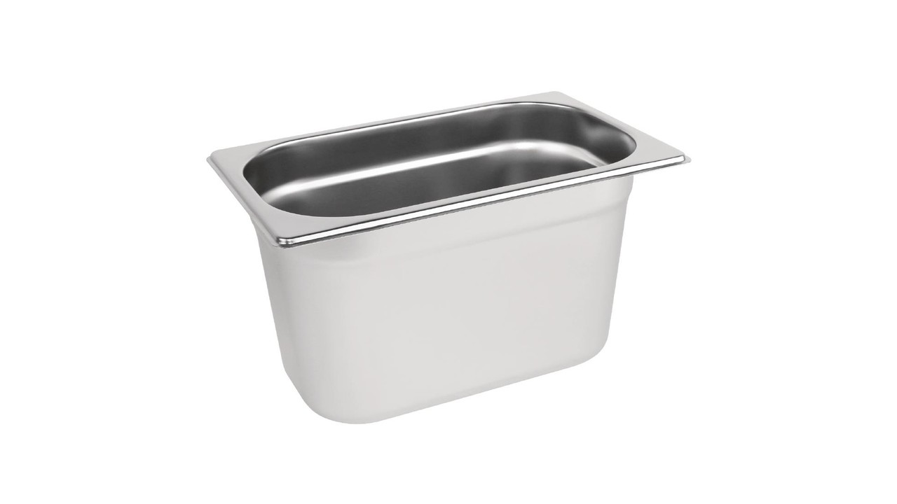 This stainless steel 1/4 gastronorm pan is perfect for use in a professional kitchen, whether for preparation, serving or storing food.