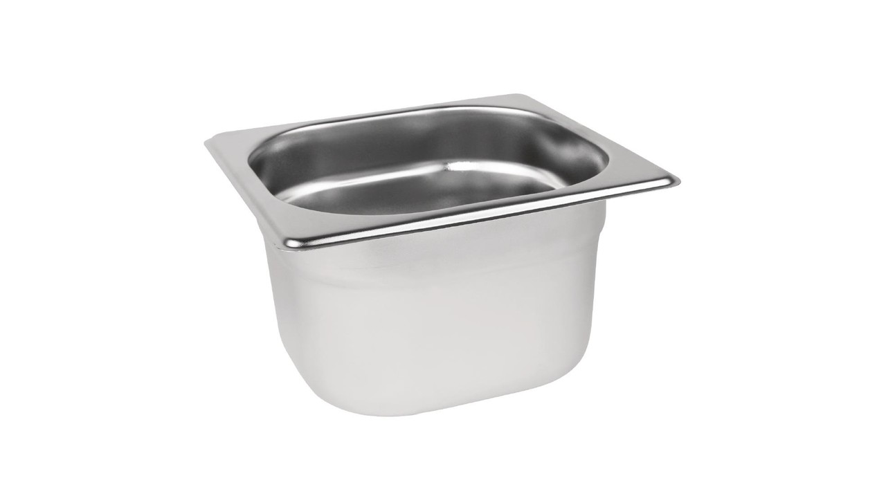 This stainless steel 1/6 gastronorm pan is perfect for use in a professional kitchen, whether for preparation, serving or storing food.