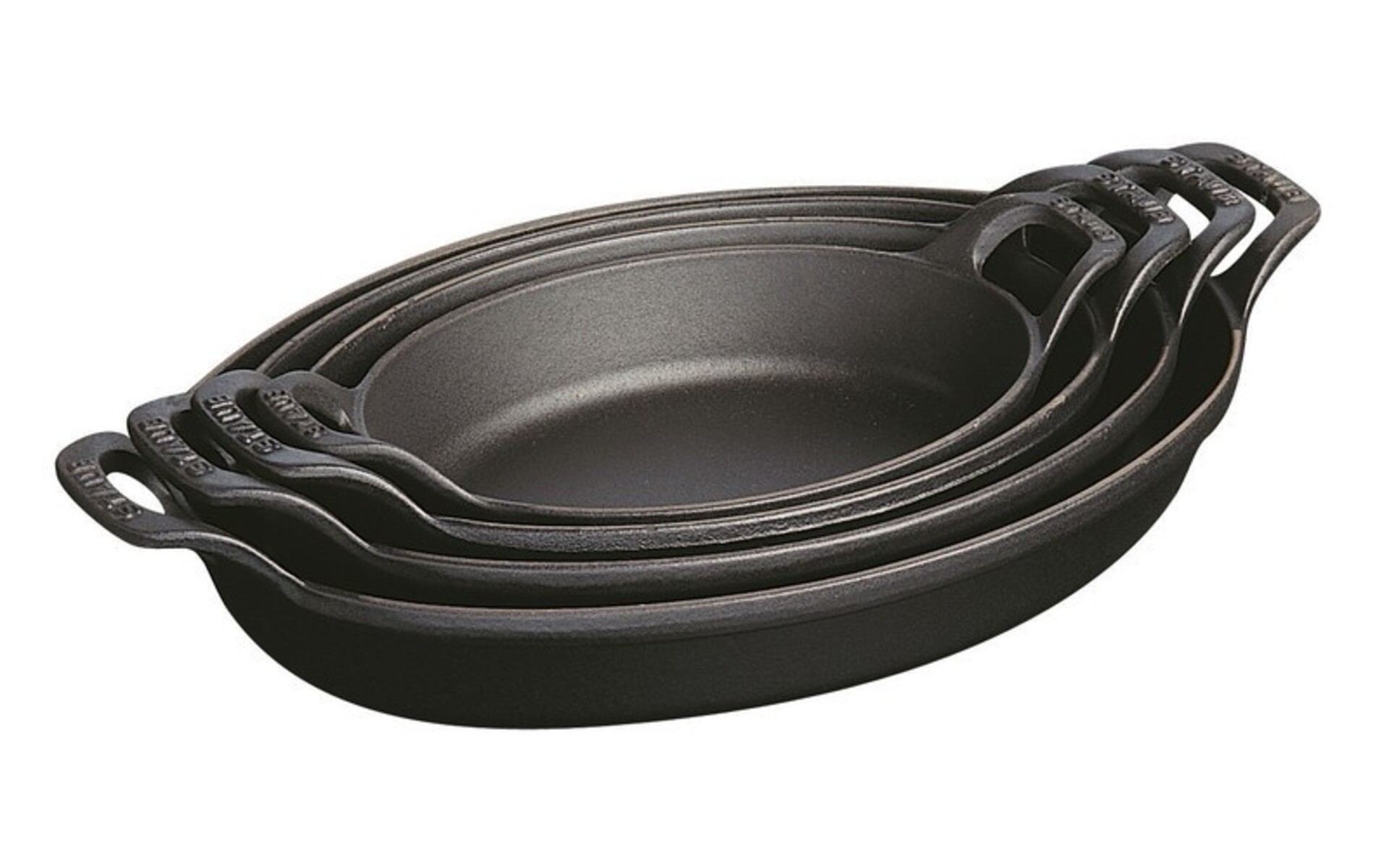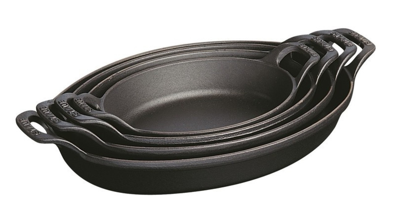 Practical, the oval cast iron dishes are stackable for easy storage and to save space in your kitchen.