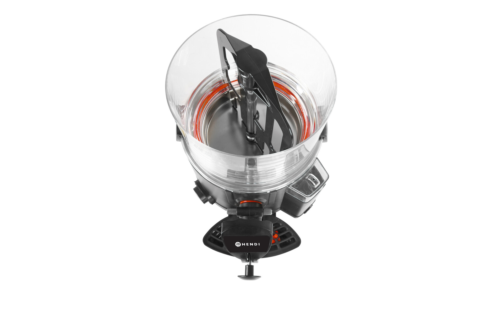 Bain-Marie heating system prevents hot chocolate from being burned to the bottom. Bottom of the container is made of stainless steel. Side walls are made of polycarbonate. Dim. 410x280x(h)465 mm. 1006 Watt .