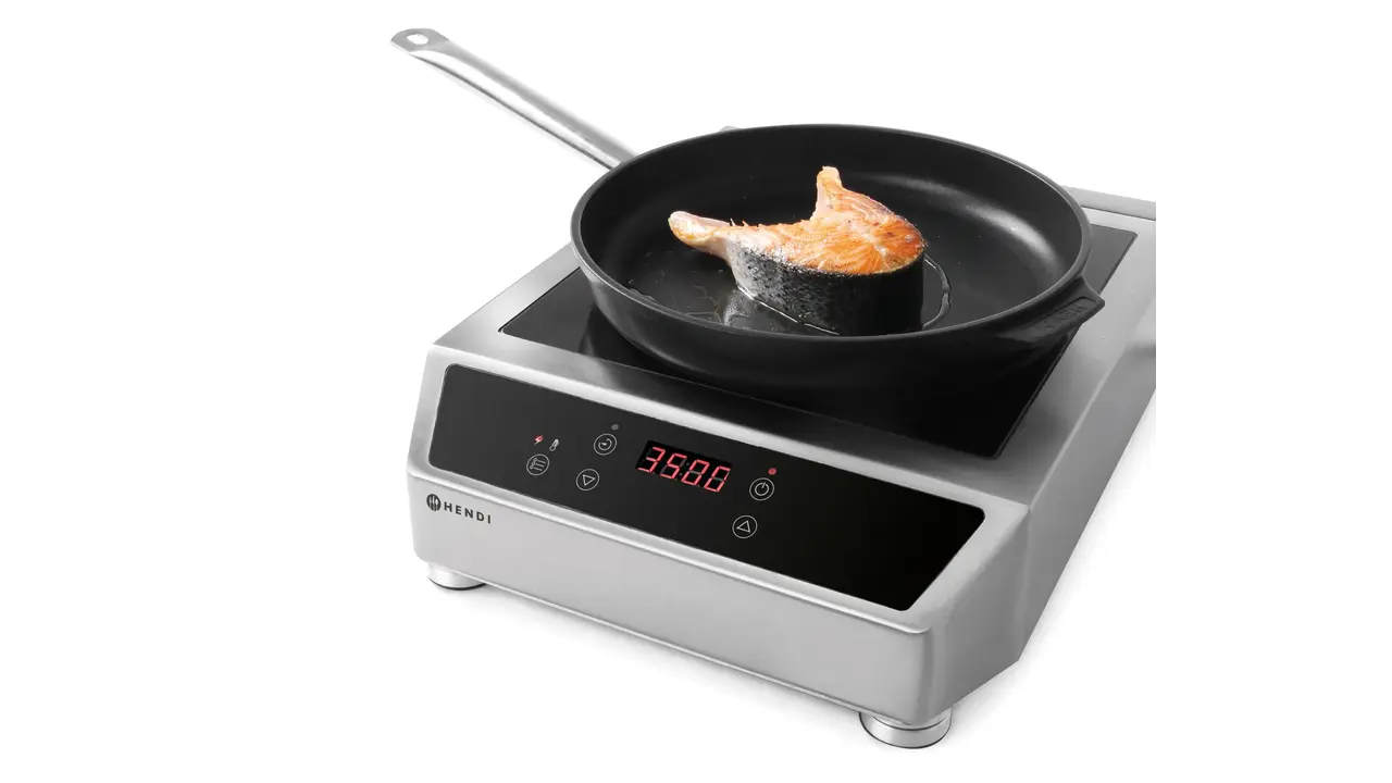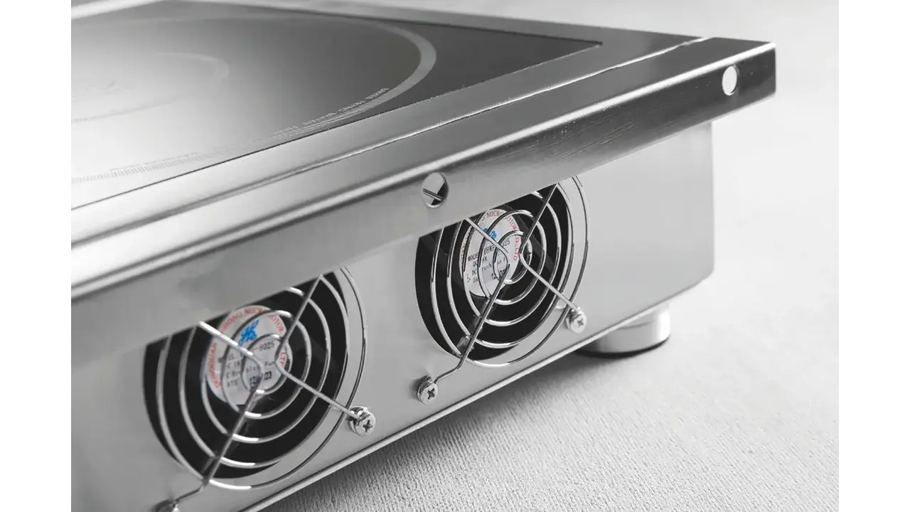 Stainless steel housing with continuous heating, even at low power. Digital touch controls for power, temperature, and timer. Equipped with grease filter, dual fan, and adjustable feet. Suitable for pans Ø 140–280 mm. Max load: 20 kg.