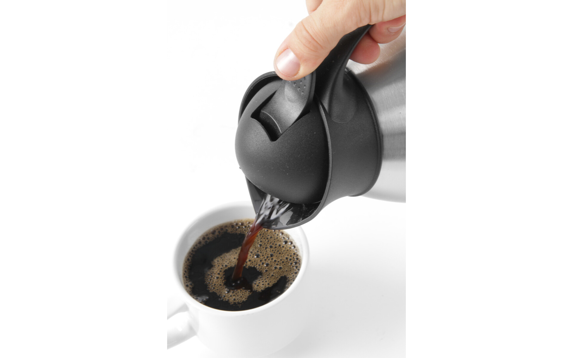 Double walled stainless steel. With black push-button cap. Top and lid made of polypropylene.
