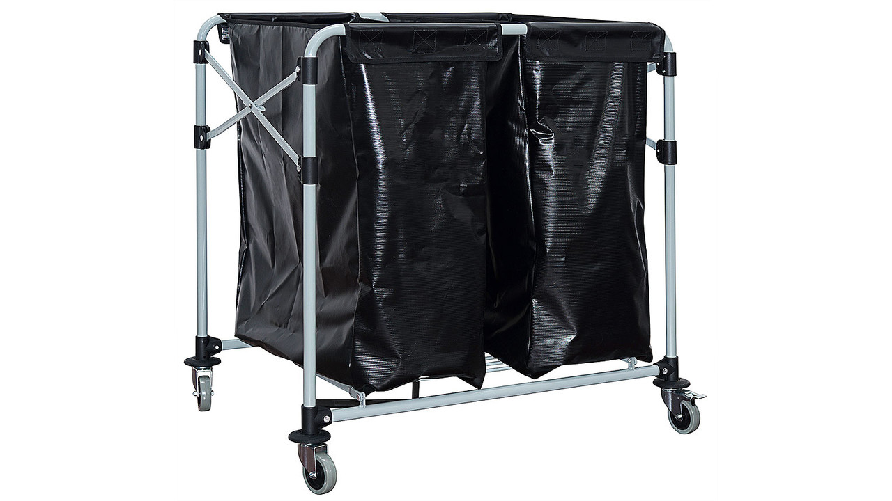 Gray coated tubular steel frame with hinged black fabric reinforced plastic bags, Capacity 2 x 150 litres.