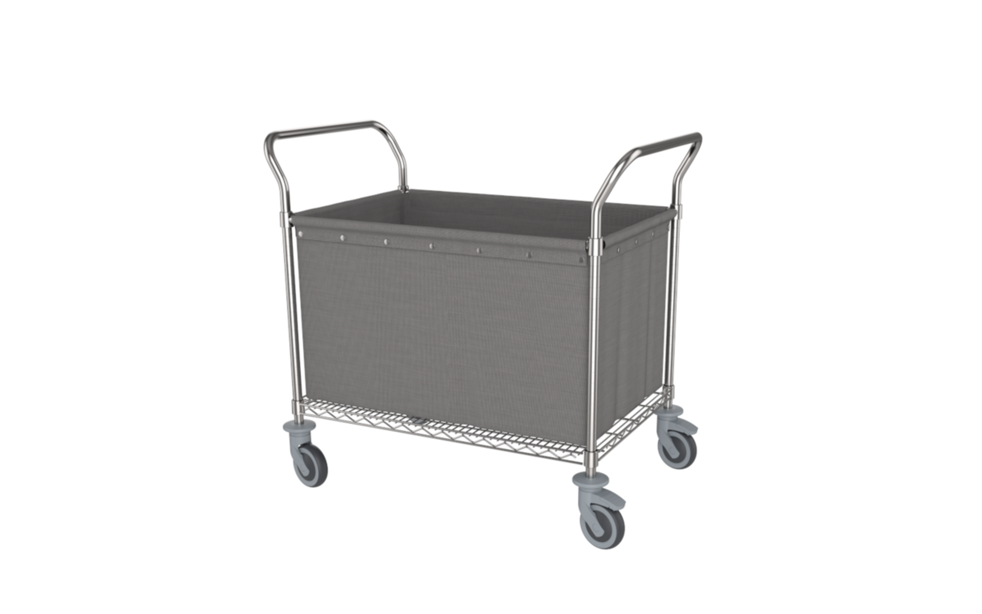 Practical laundry trolley made of chrome-plated steel with laundry bag made of 100% polyester with PU coating. The laundry bag is attached to the structure with press studs.