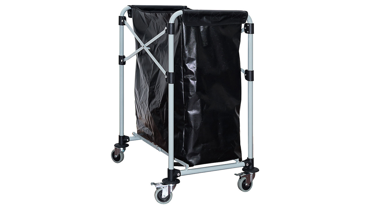 grey coated steel tube frame with hinged black fabric-reinforced plastic bags, folds to only 15 cm, sturdy wheels, two wheels with brakes on two of them