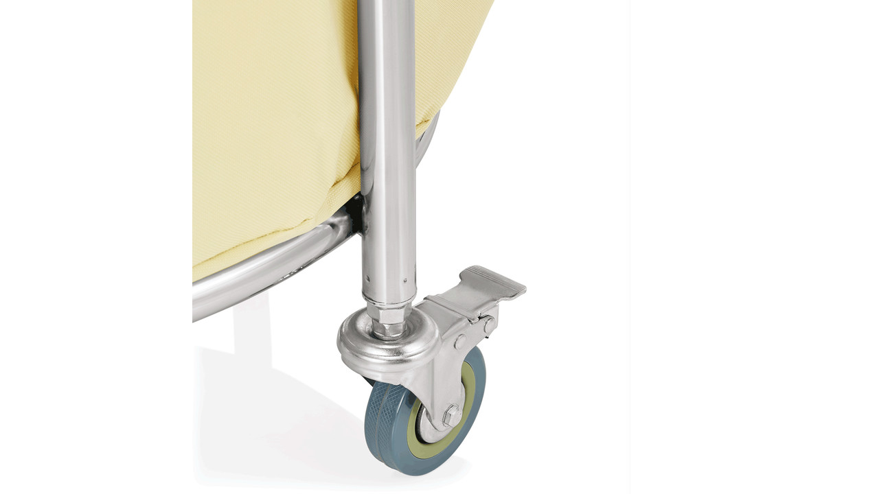 4 swivel wheels Ø 7.5 cm, of which 2 with brakes. Stainless steel 18/10 tubular frame Ø 2.5 cm. Total height : 80 cm. Weight : 8 kg. Color of the bag : beige.
