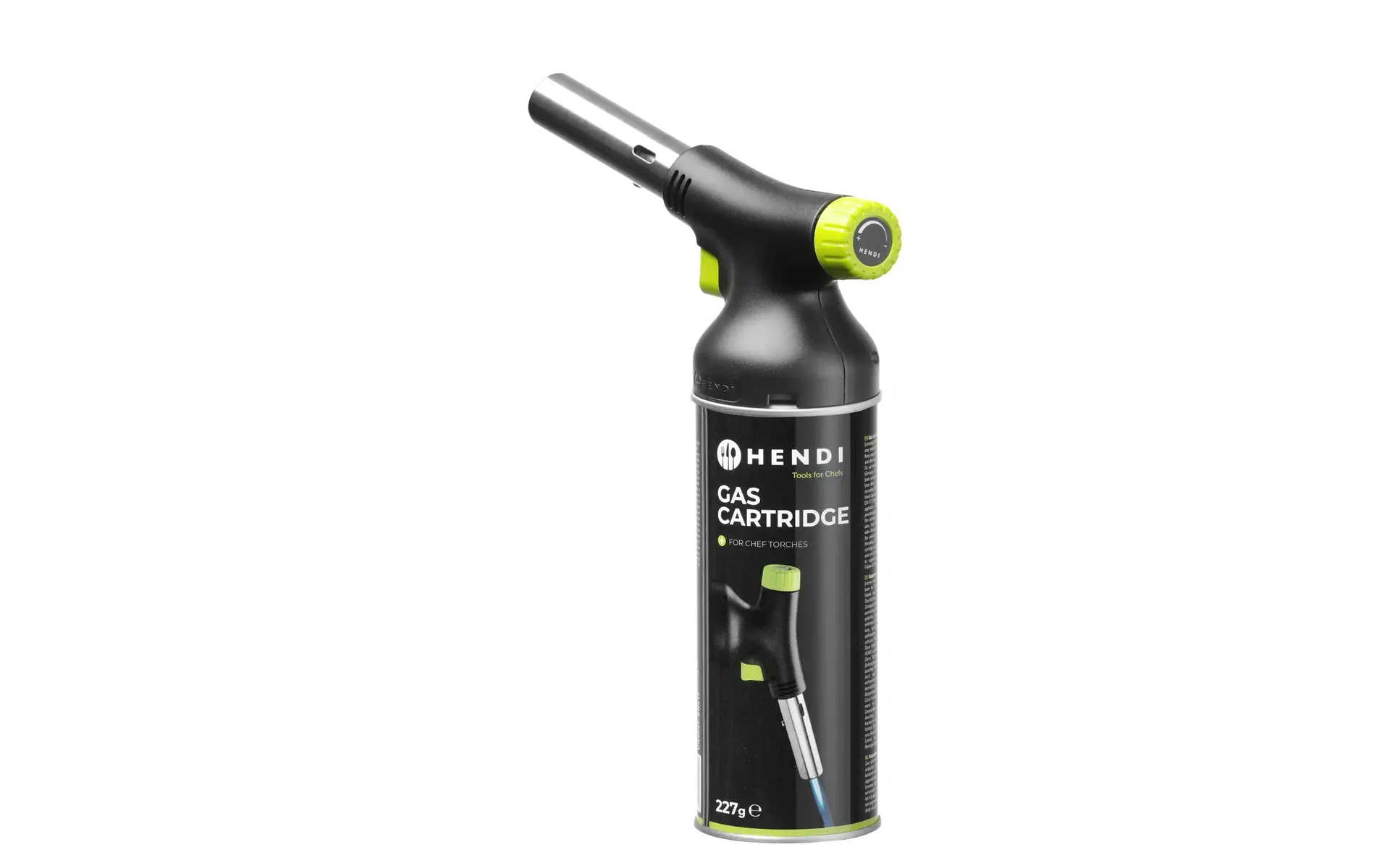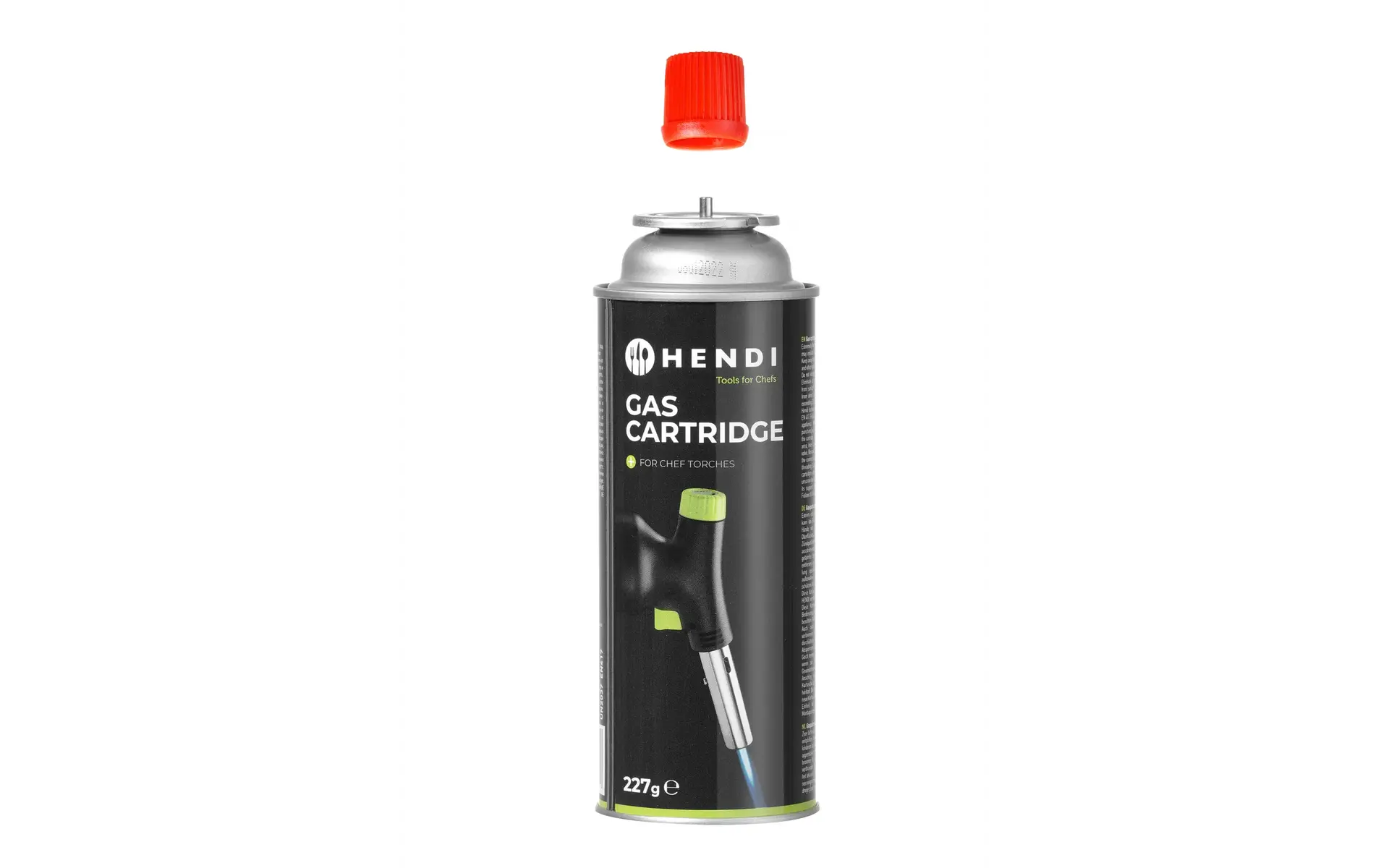 Suitable for use with HENDI chef torches. Not suitable for refilling lighters or similar devices. Packed per 4 gas canisters. Order unit: box with 7 sets of 4 gas canisters (28 gas canisters).