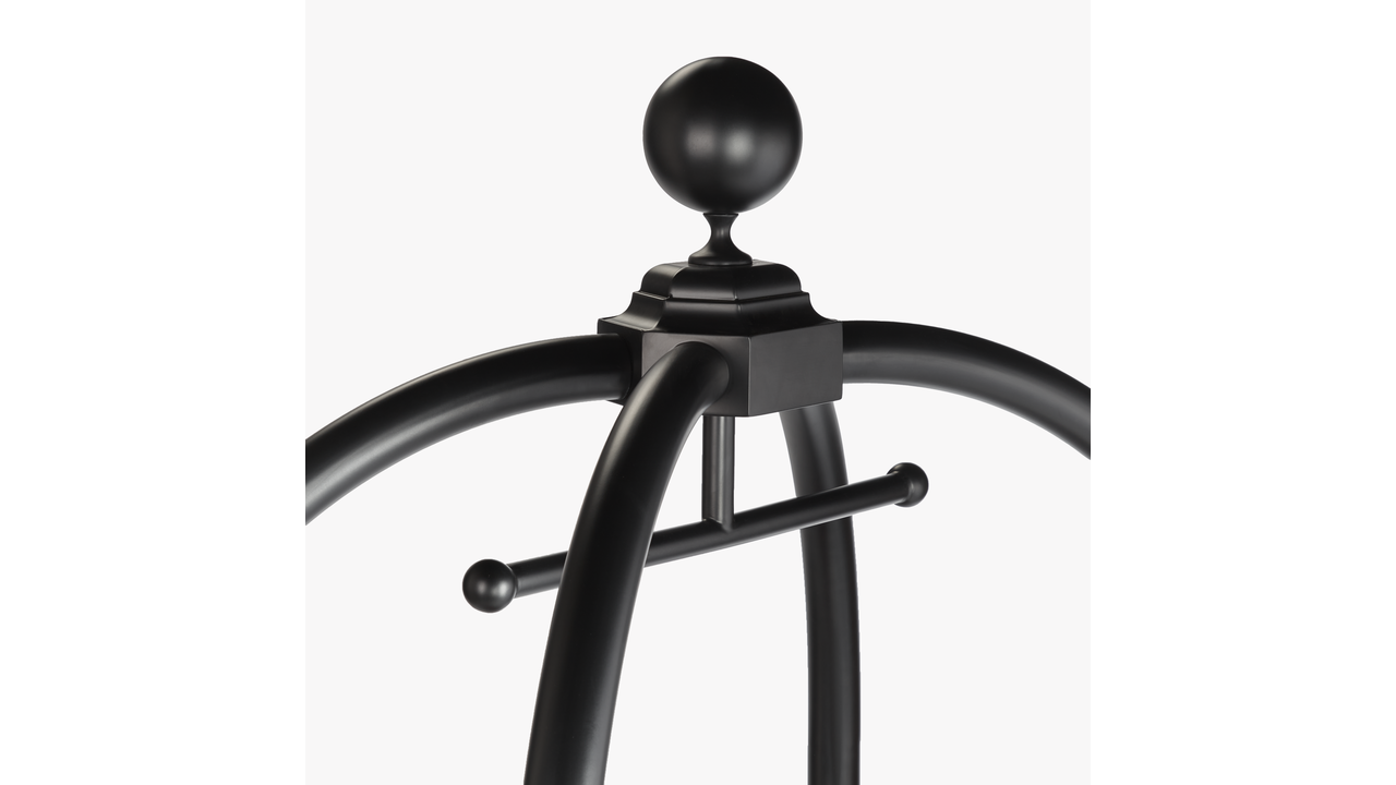 This luxurious trolley is black powder coated, has 2 swivel castors with a diameter of 20 cm with brakes and 2 fixed castors. Tubular frame is 5 cm in diameter. Protection rubber all around. Includes an integrated wardrobe rail.