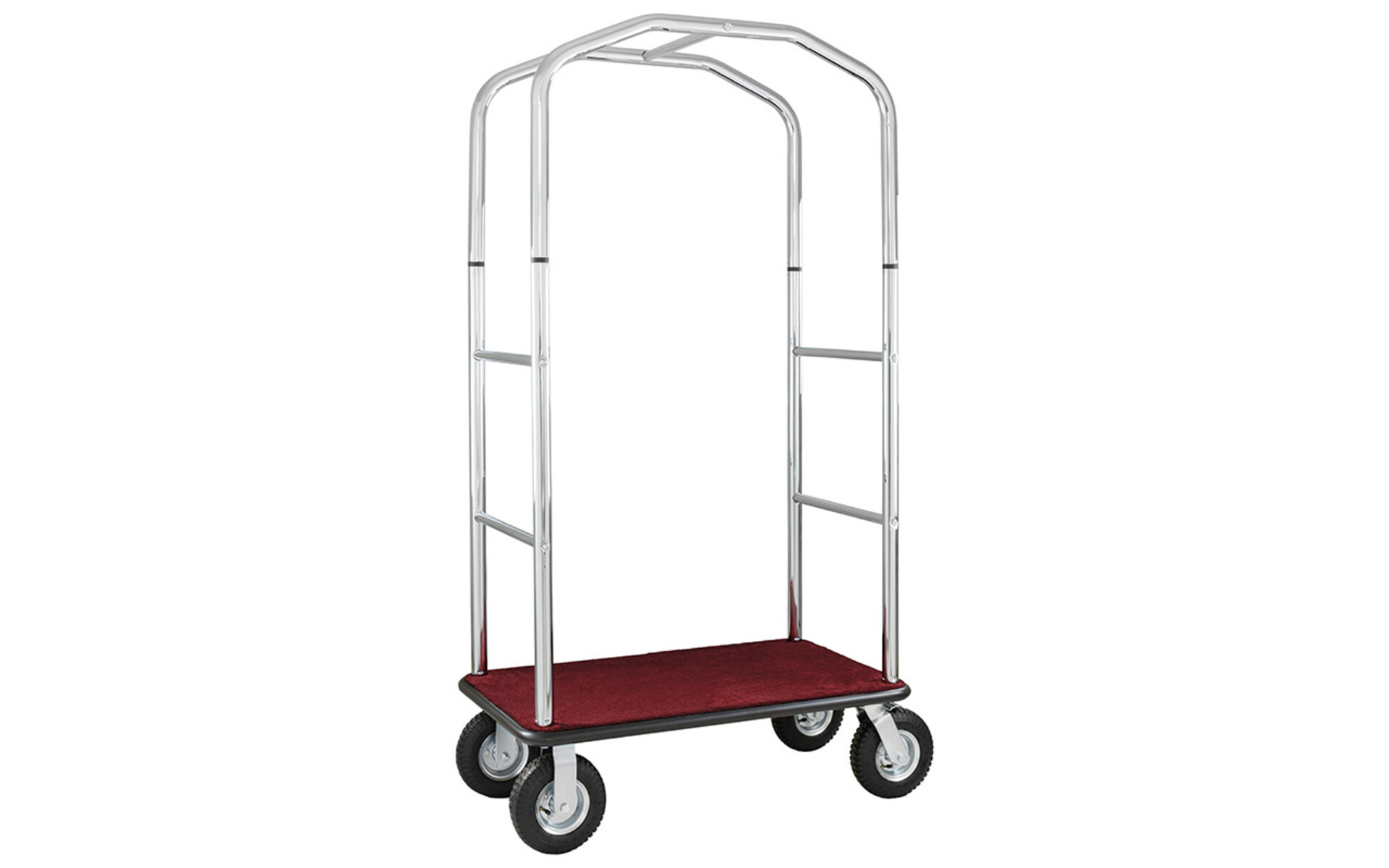 Luggage trolleys and clothes racks. Wooden base covered with coloured carpet, available in red or blue – rod support in brass-plated or chromeplated steel tube ø 40 mm – perimeter rubber shock absorber – multidirectional wheels ø 200 mm.