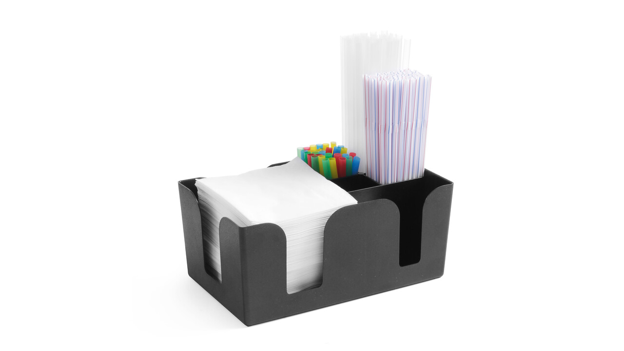 Straws, napkins, stirrers, etc. at your fingertips. This convenient bartender container has 6 compartments of different sizes and can hold many accessories.