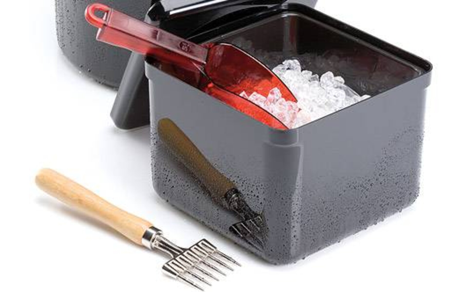 With removable inner PS container serves as drainer. Holds about 150 ice cubes. Keeps the ice cubes in shape for up to 5 hours.