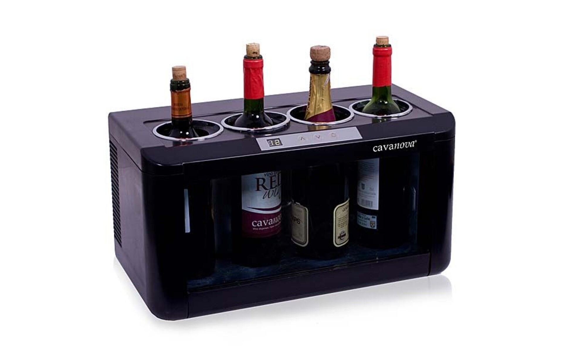 Electro-thermal cooling for 4 bottles Adjustable temperature of 7°C till 18°C Inner lighting LCD display Good visibility of the 4 bottles Diameter of each hole 88,5 mm Dimensions : 48 x 26 x h 26 cm 230 Volt
