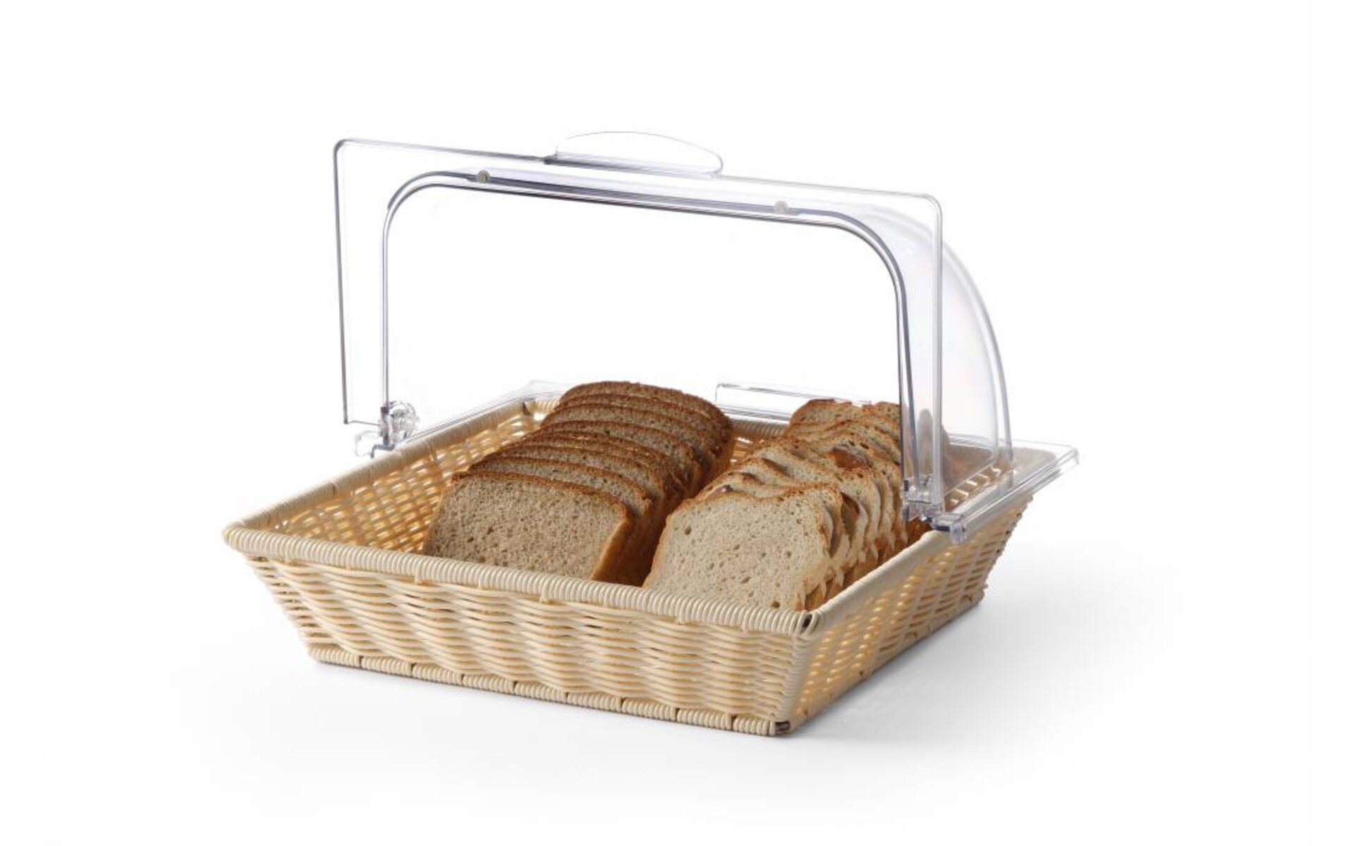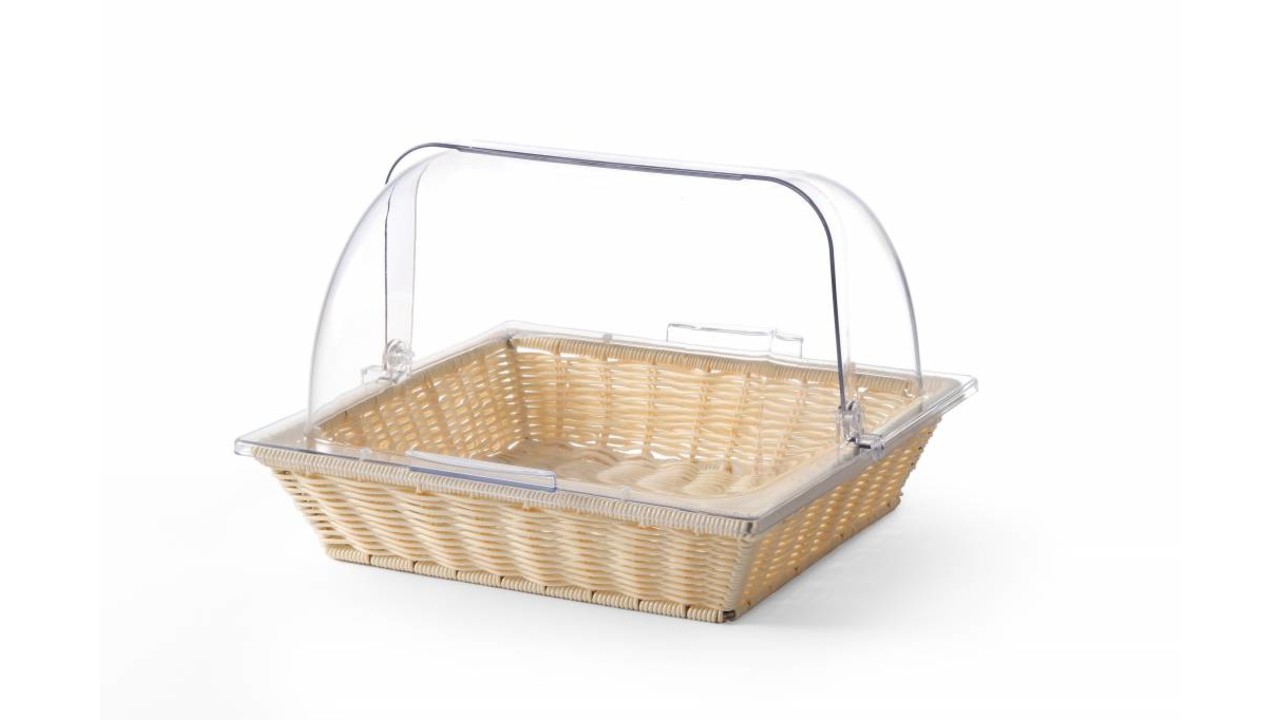 Dim 365x335x(H)245 mm Basket made of heavy duty polypropylene (poly-rattan). Roll top hood made of polycarbonate.